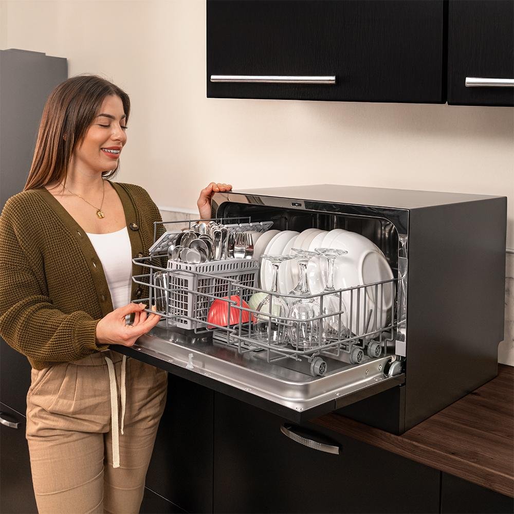 - Ahorra espacio, tiempo y esfuerzos. Gracias a su capacidad de 6 cubiertos podrás ahorrar espacio, tiempo y esfuerzo al lavar tus platos y utensilios de forma eficiente, rápida y cómoda.