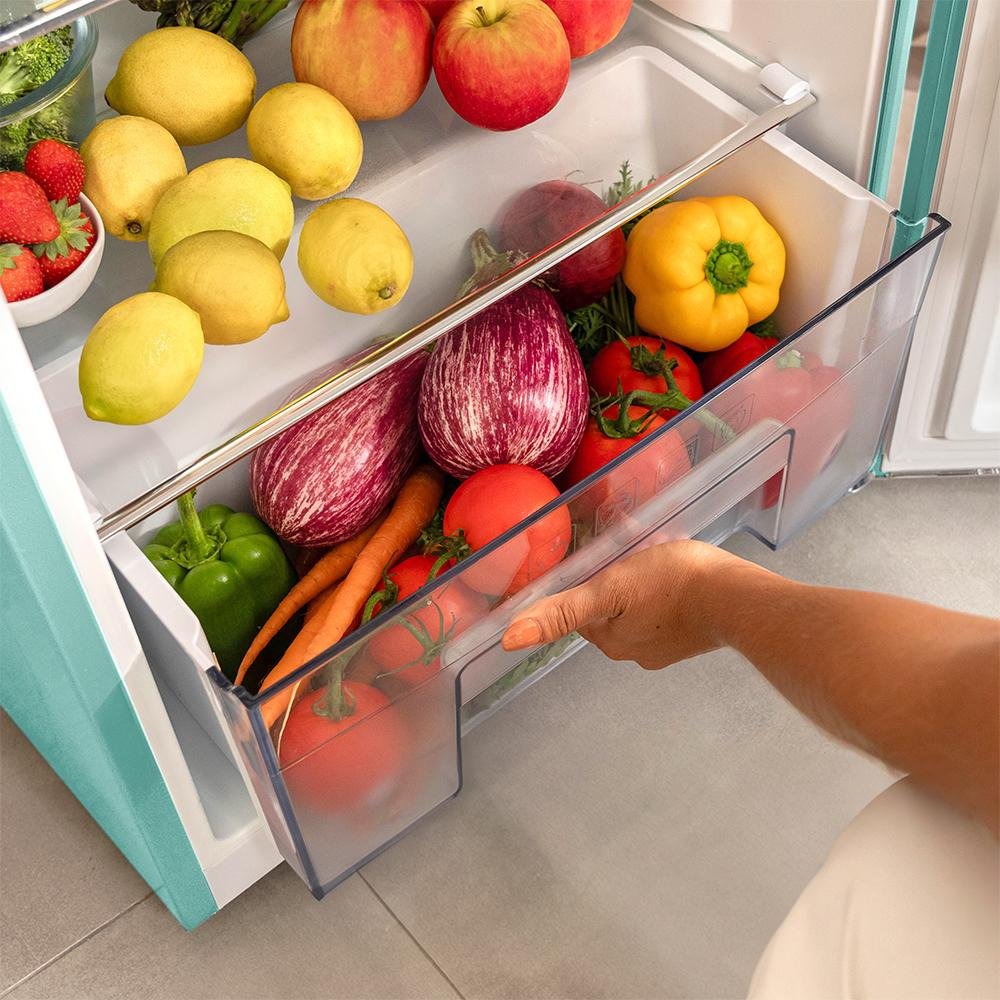 Bolero CoolMarket 2D Origin 215 Green E Frigorífico retro con capacidad de 215L, clase E, Luz interior, tirador cromado, bandejas cristal y control de temperatura.