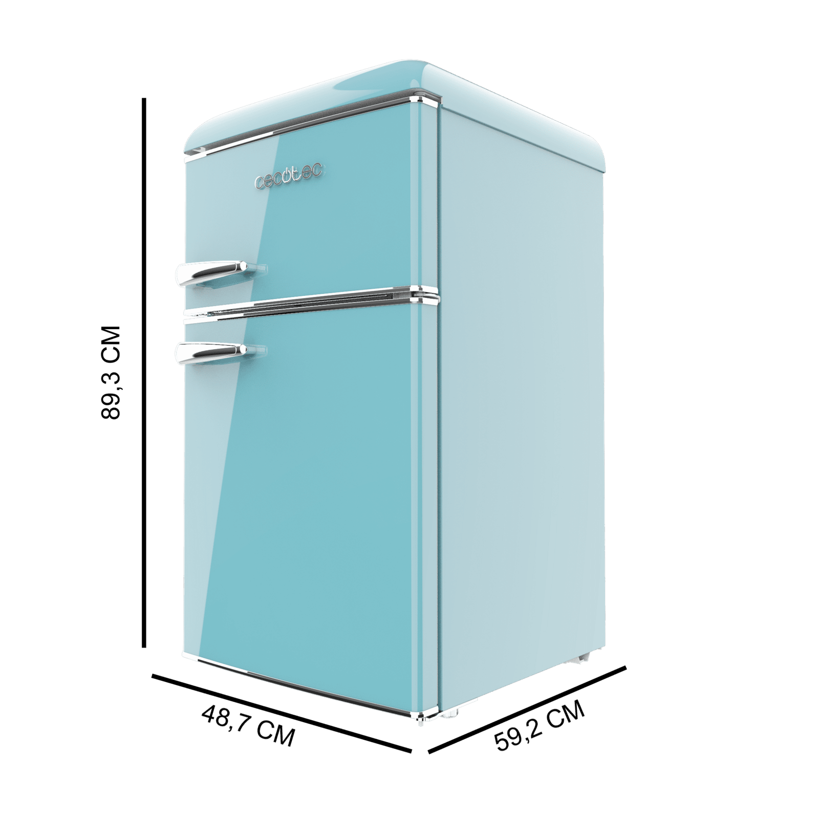 Bolero CoolMarket 2D Origin 86 Blue E Mini frigorífico retro de dos puertas azul de 89,3cm de alto y 48,7 de ancho con capacidad de 86L, clase energética E, LED interior y tirador cromado.