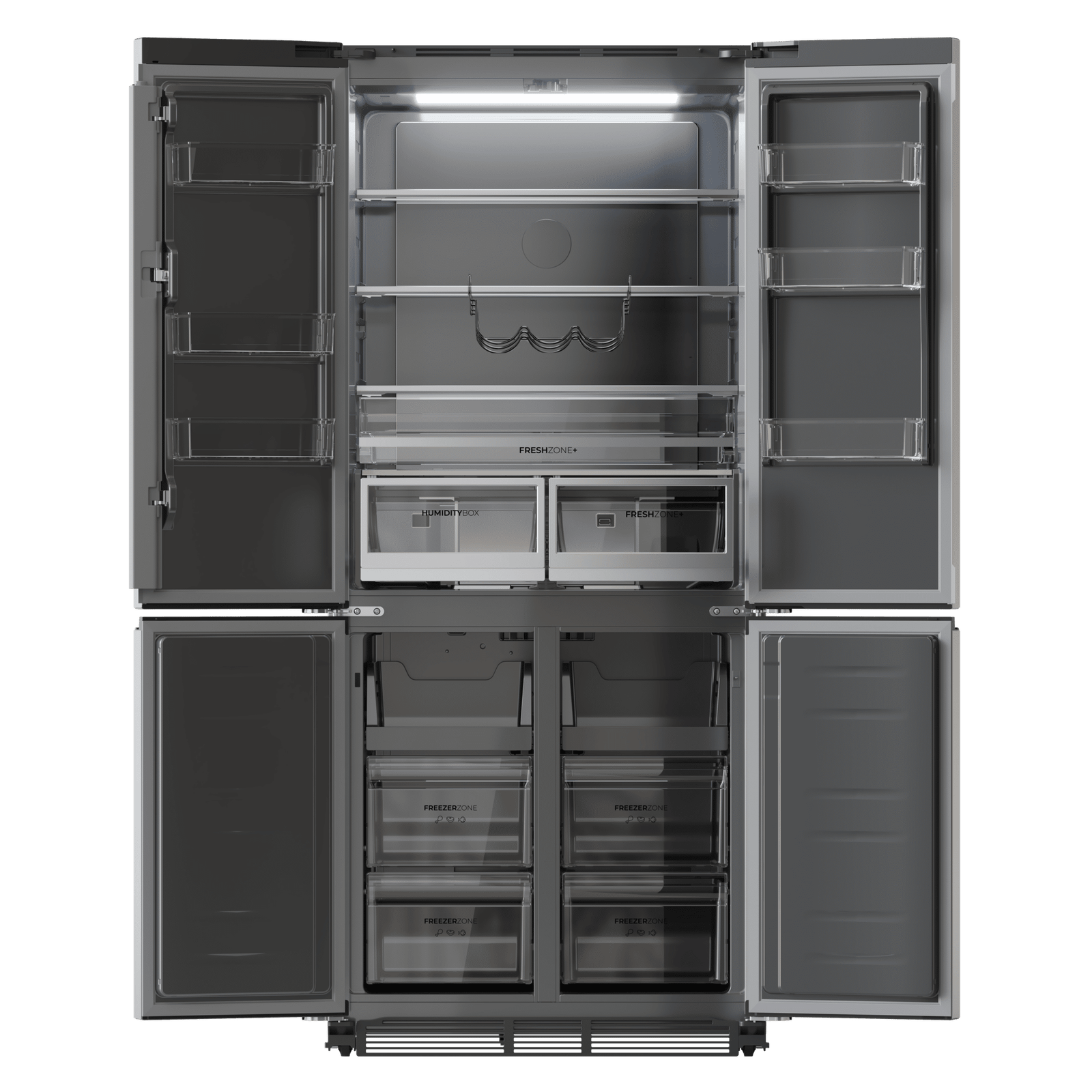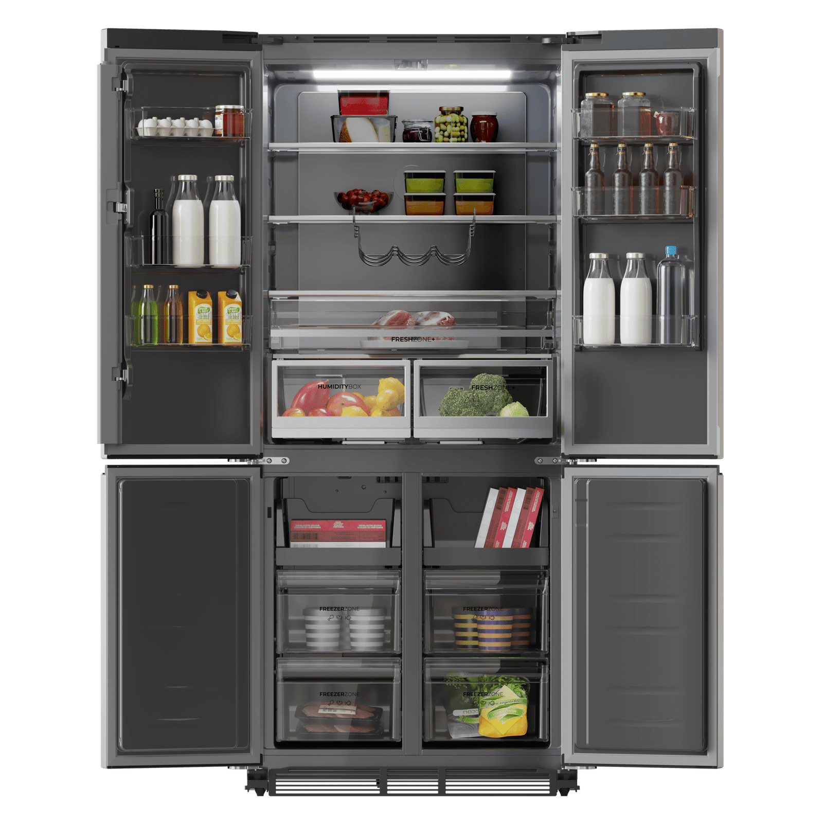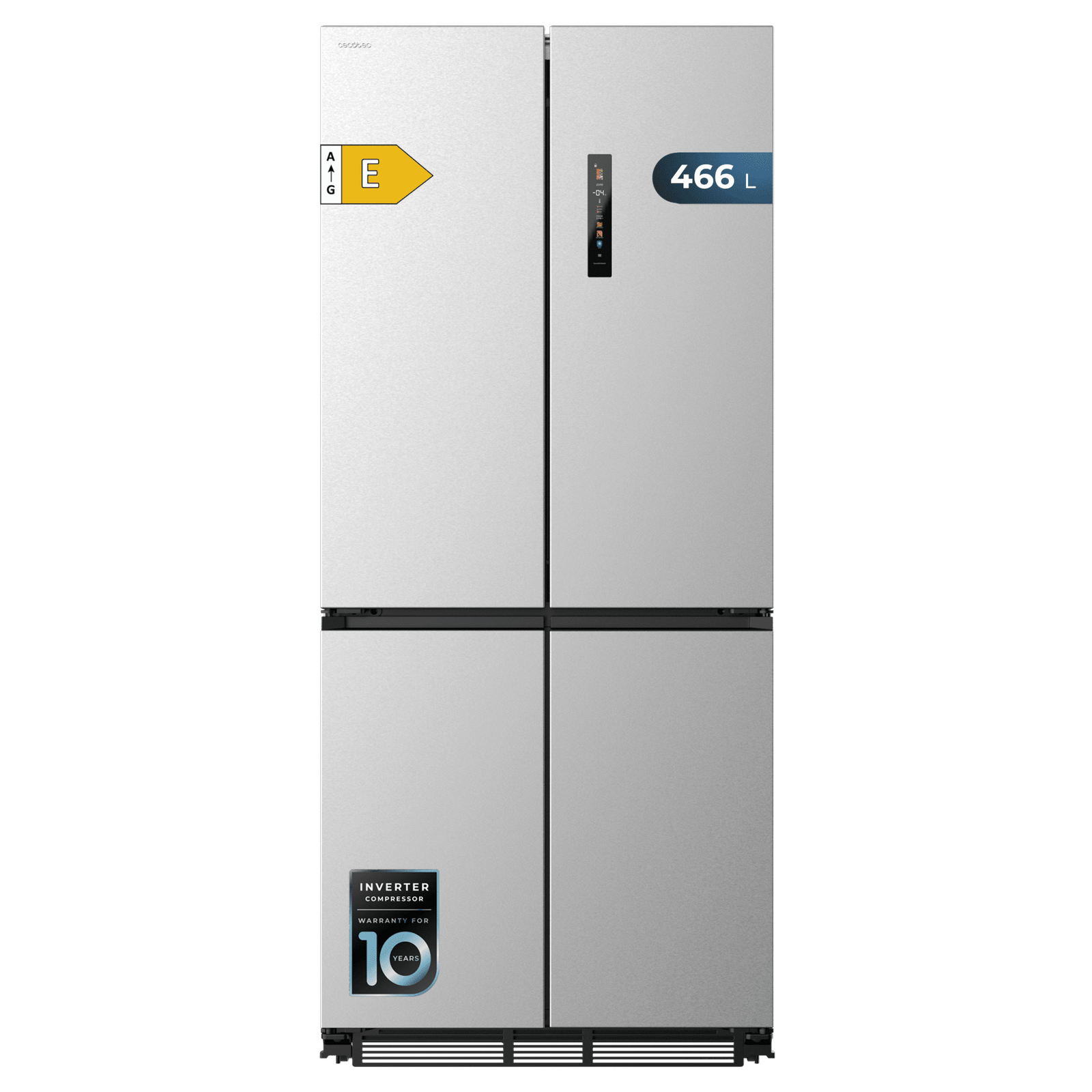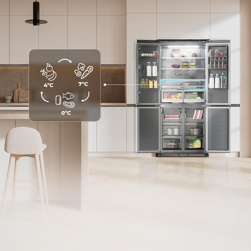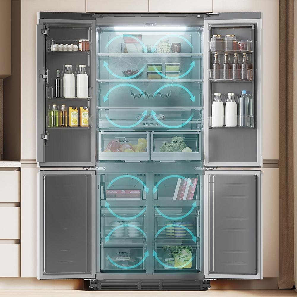 Domina el frío con su diseño de 4 puertas que albergan un interior de 466 L. Abre por zonas, gana en comodidad, evita pérdidas de frío y conserva mejor tus alimentos.