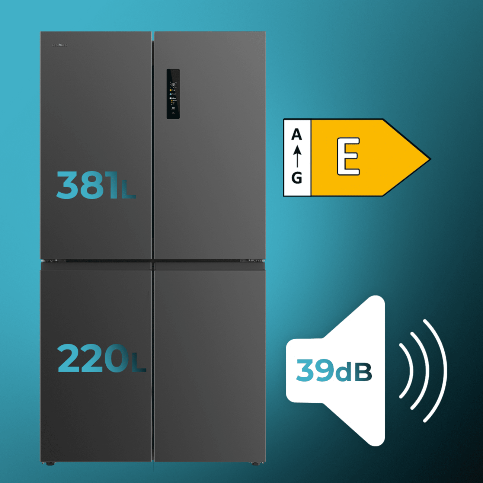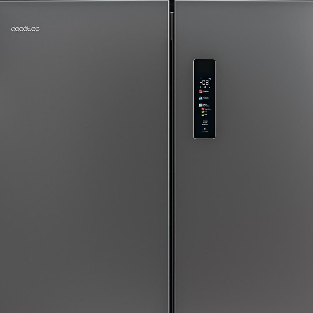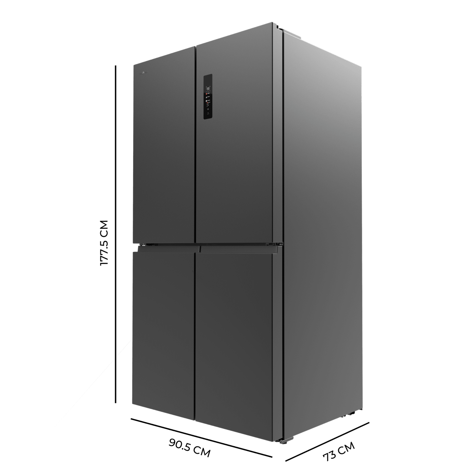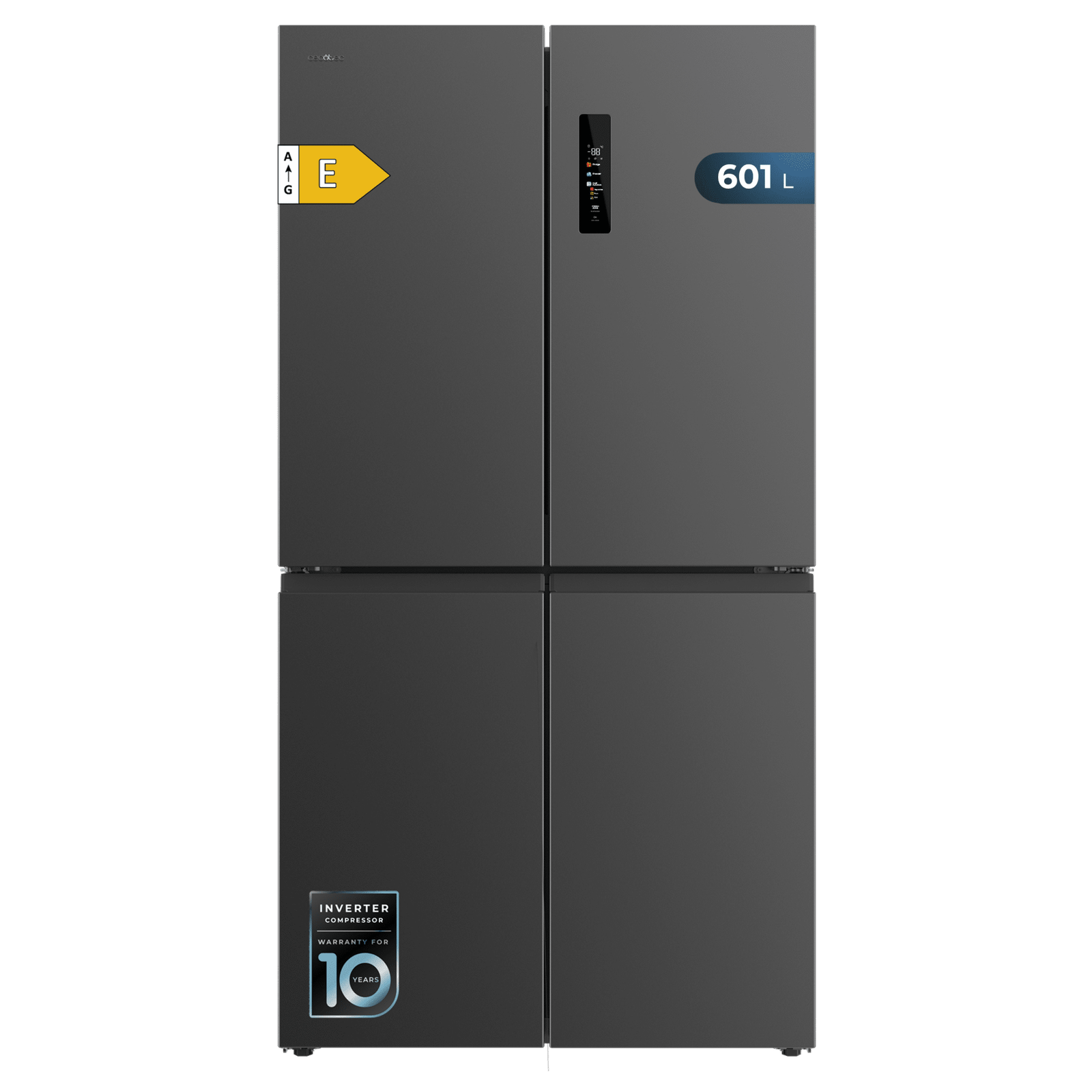 Bolero CoolMarket 4D 601 Dark E Frigorífico de 4 Puertas acero inoxidable oscuro, Capacidad de 601 Litros, Ancho de 90.5 cm alto de 177.5 cm, Sistema de conservación NoFrost, Metal Cooling, Cajón Control de Humedad y Cajón convertible, Motor Inverter Plus silencioso y de bajo consumo, Display digital exterior, Clasificación energética Clase E, Funciones Fast Cooling y Fast Freezing, Alarma de puerta Abierta y Alarma temperatura y mal funcionamiento, Modo ECO