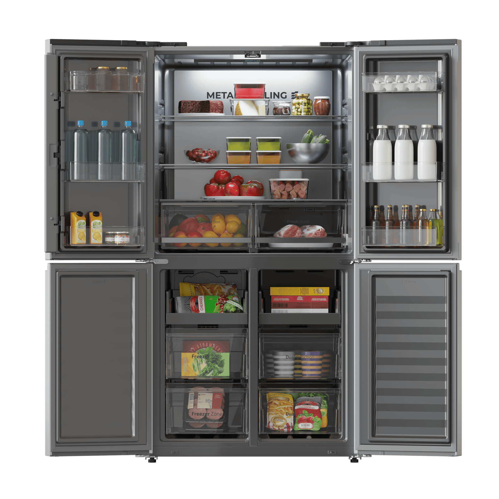 • Frigorífico 4 Puertas: el diseño de 4 puertas posibilita unos estantes más anchos y sin interrupciones. La capacidad se multiplica dejando espacio a grandes bandejas y alimentos.