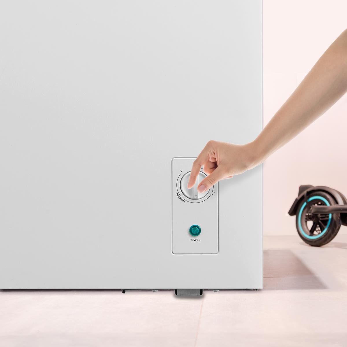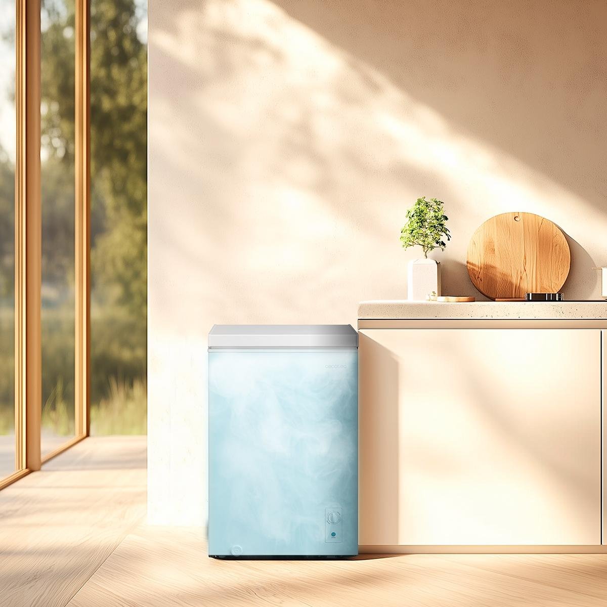 - Diseño minimalista y puerta flotante. Tirador y bisagras integradas que permiten colocar el congelador en espacios reducidos.