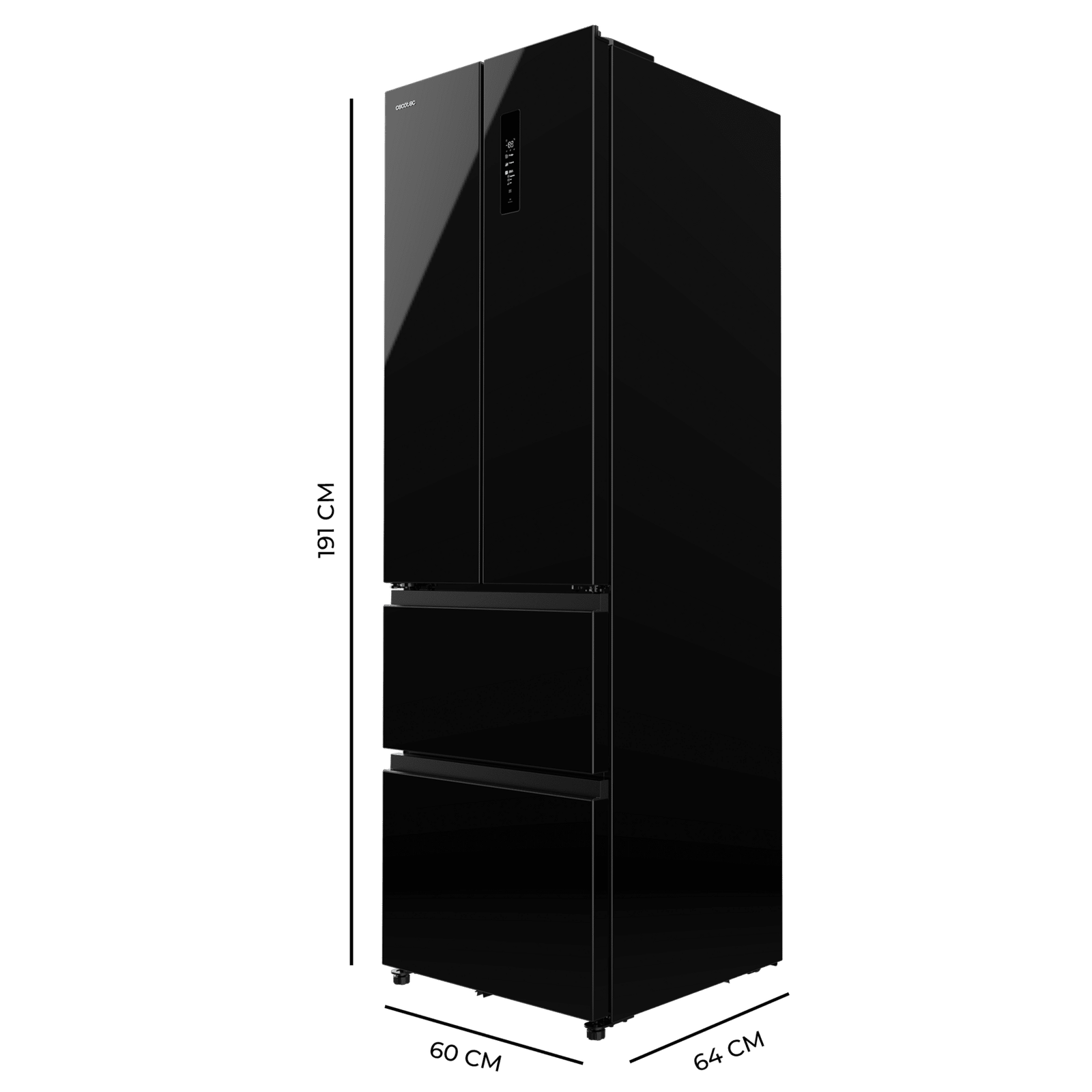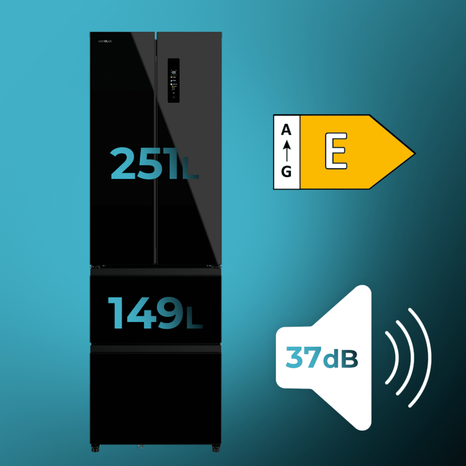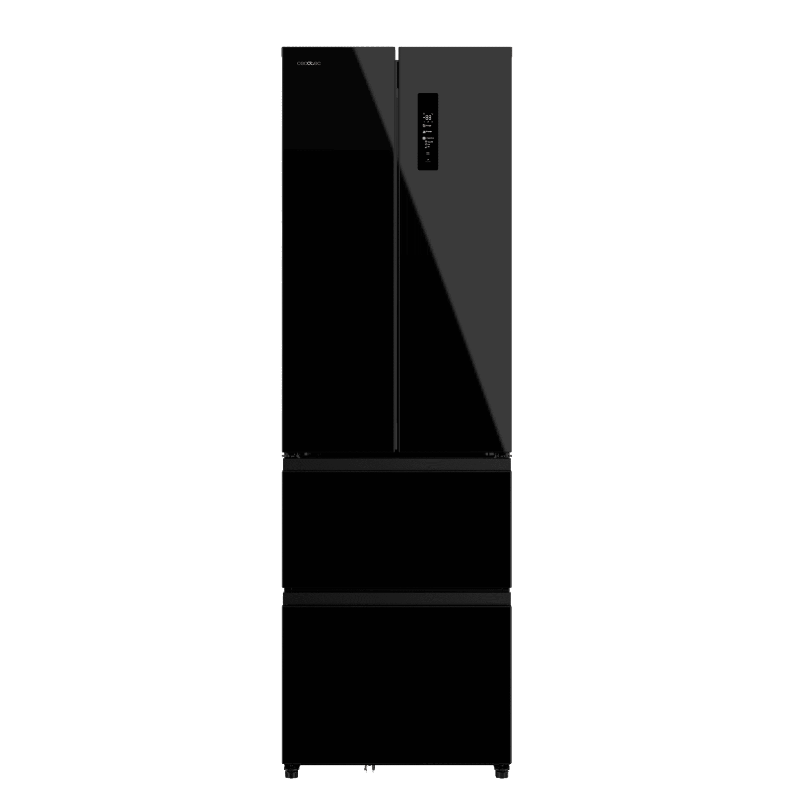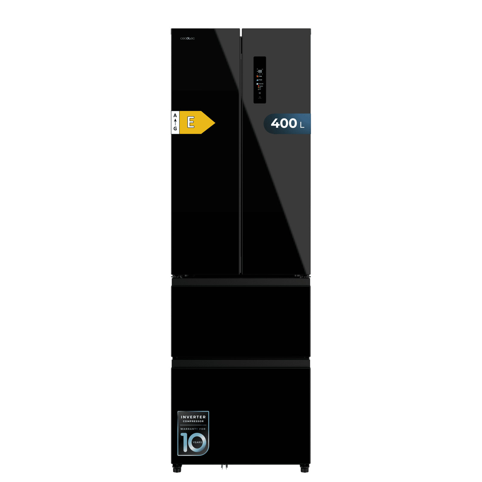 Bolero CoolMarket Combi F2D 400 Black Glass E Frigorífico Combi French Door 4 Puertas Cristal Negro, Capacidad de 400 Litros, Ancho de 60 cm y alto de 191 cm, Sistema Total NoFrost, Max Inside, Distribución de frío Multi AirFlow, Display Digital Exterior, , Cajones para fruta y verdura, Clase E, Compresor Inverter, Funciones Fast Cooling, Fast Freezer, Modo ECO, Alarmas puerta abierta, temperatura y fallo de funcionamiento.