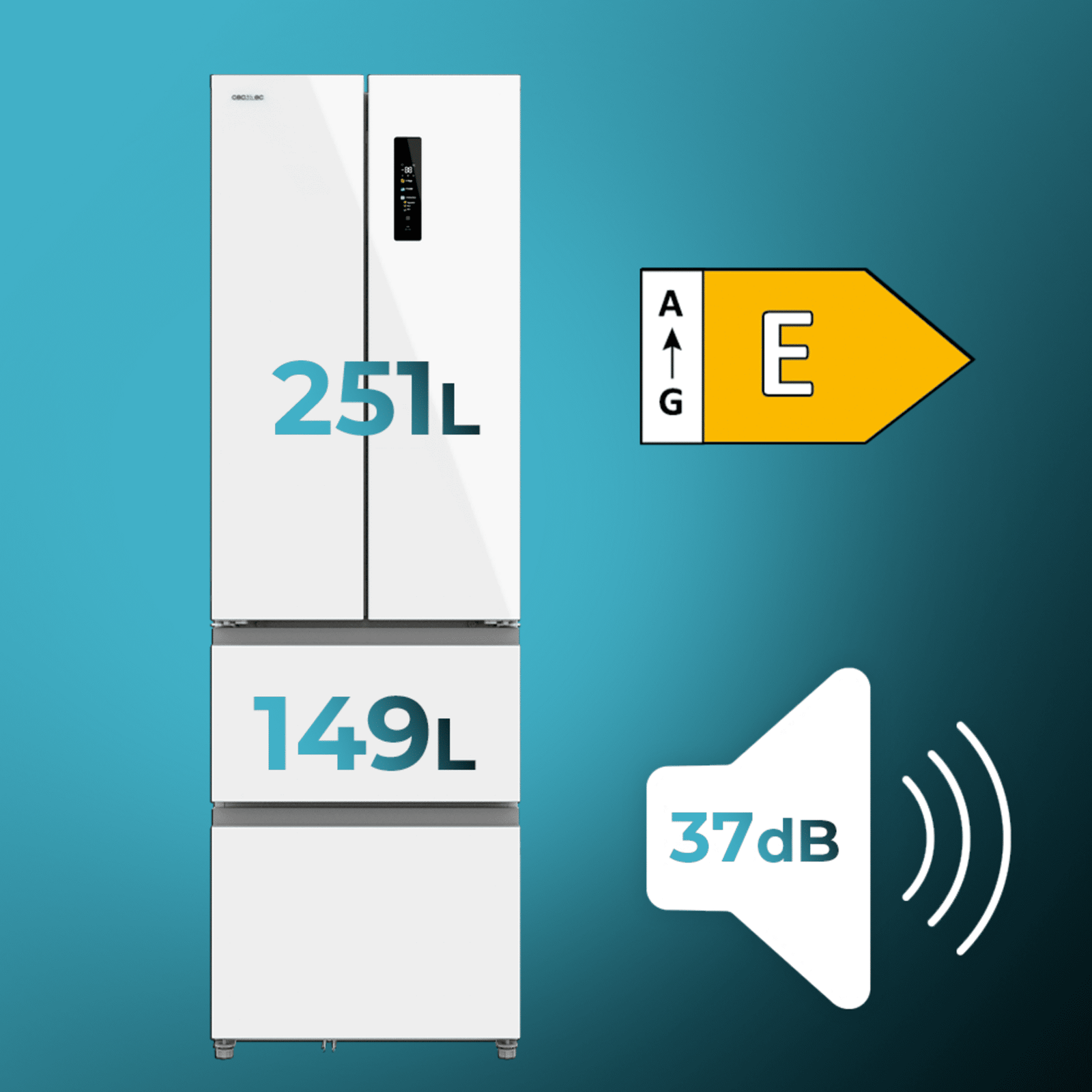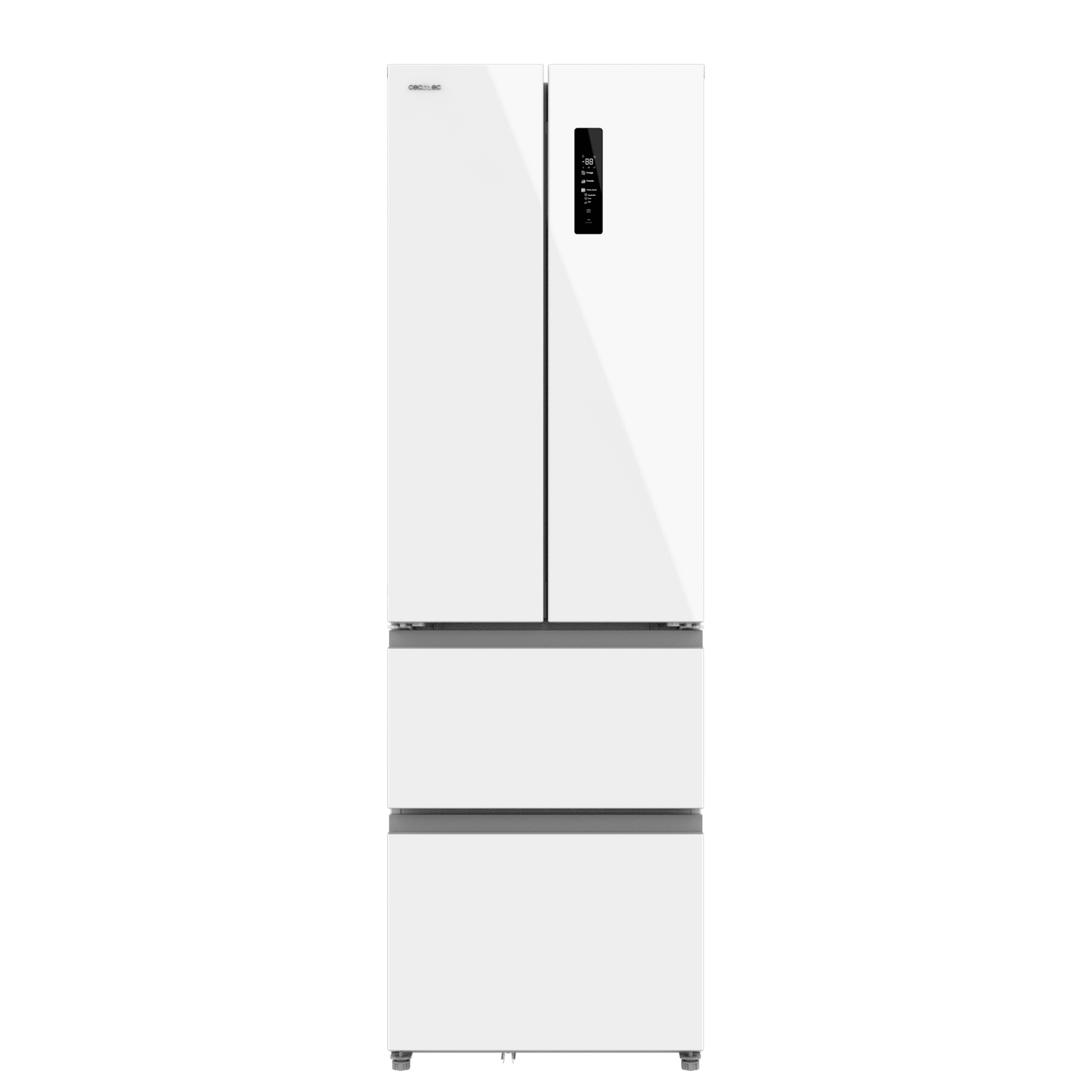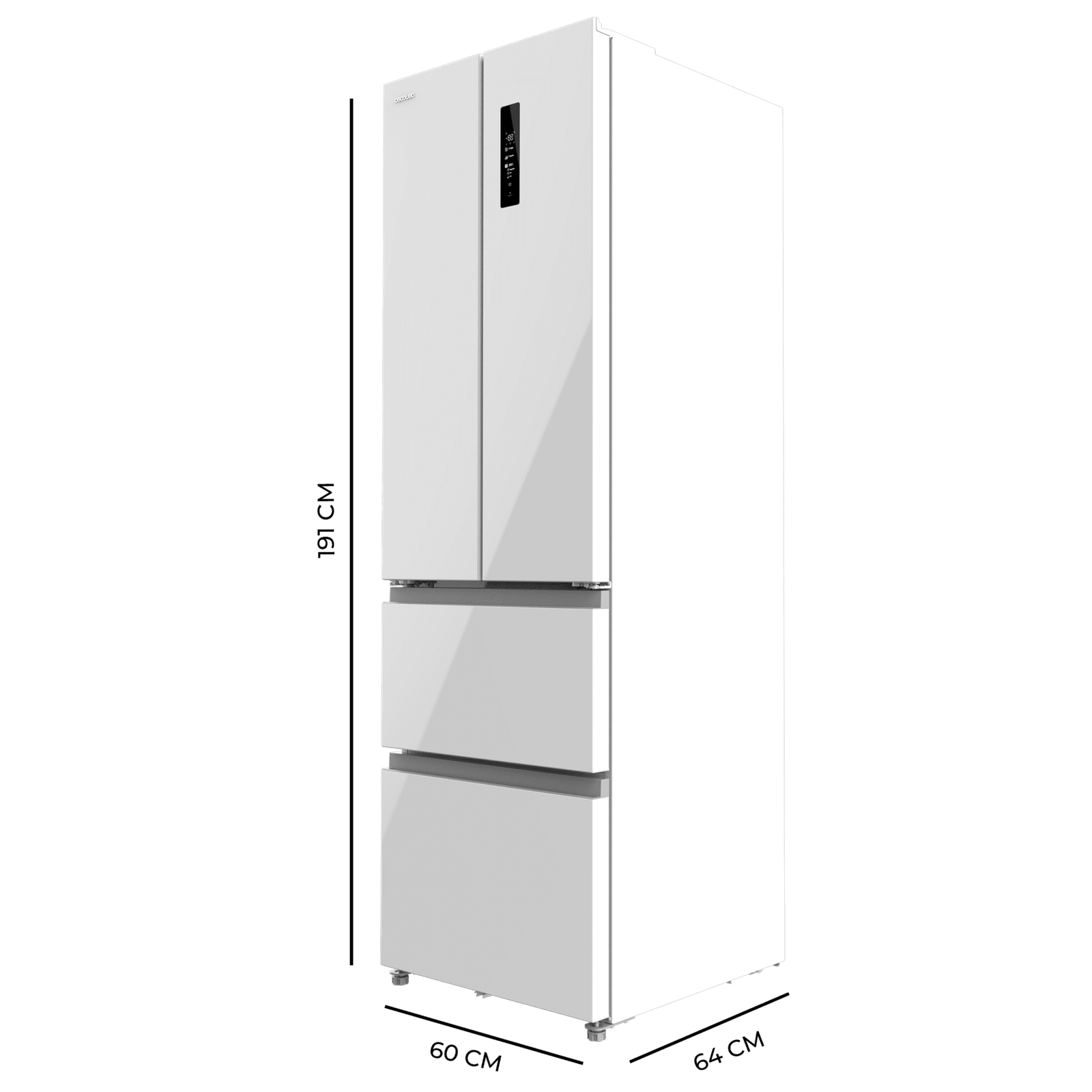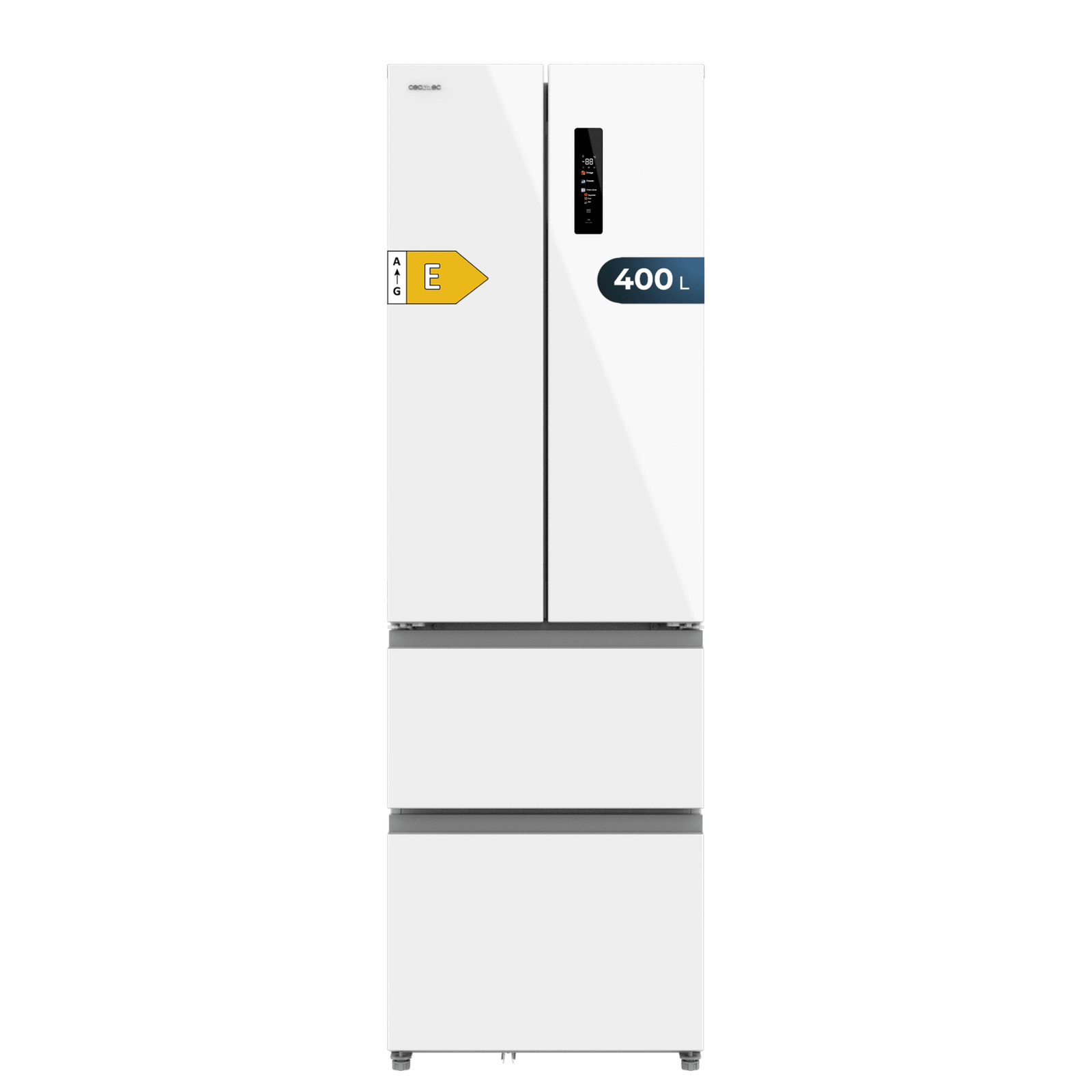 Bolero CoolMarket Combi F2D 400 White Glass E Frigorífico Combi French Door 4 Puertas Cristal Blanco, Capacidad de 400 Litros, Ancho de 60 cm y alto de 191 cm, Sistema Total NoFrost, Max Inside, Distribución de frío Multi AirFlow, Display Digital Exterior, Cajones para fruta y verdura, Clase E, Compresor Inverter de bajo consumo y silencioso, Fast Cooling, Fast Freezer, Modo ECO