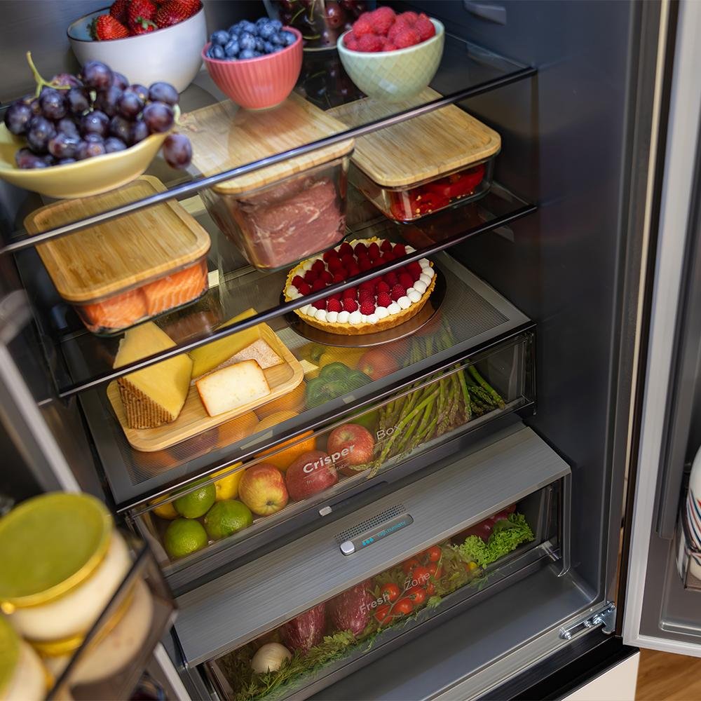 El frigorífico ofrece una capacidad de 400 L gracias al sistema Max Inside, que reduce el grosor de las paredes para maximizar el espacio interior. Además, su interior cuenta con un exclusivo color gris.