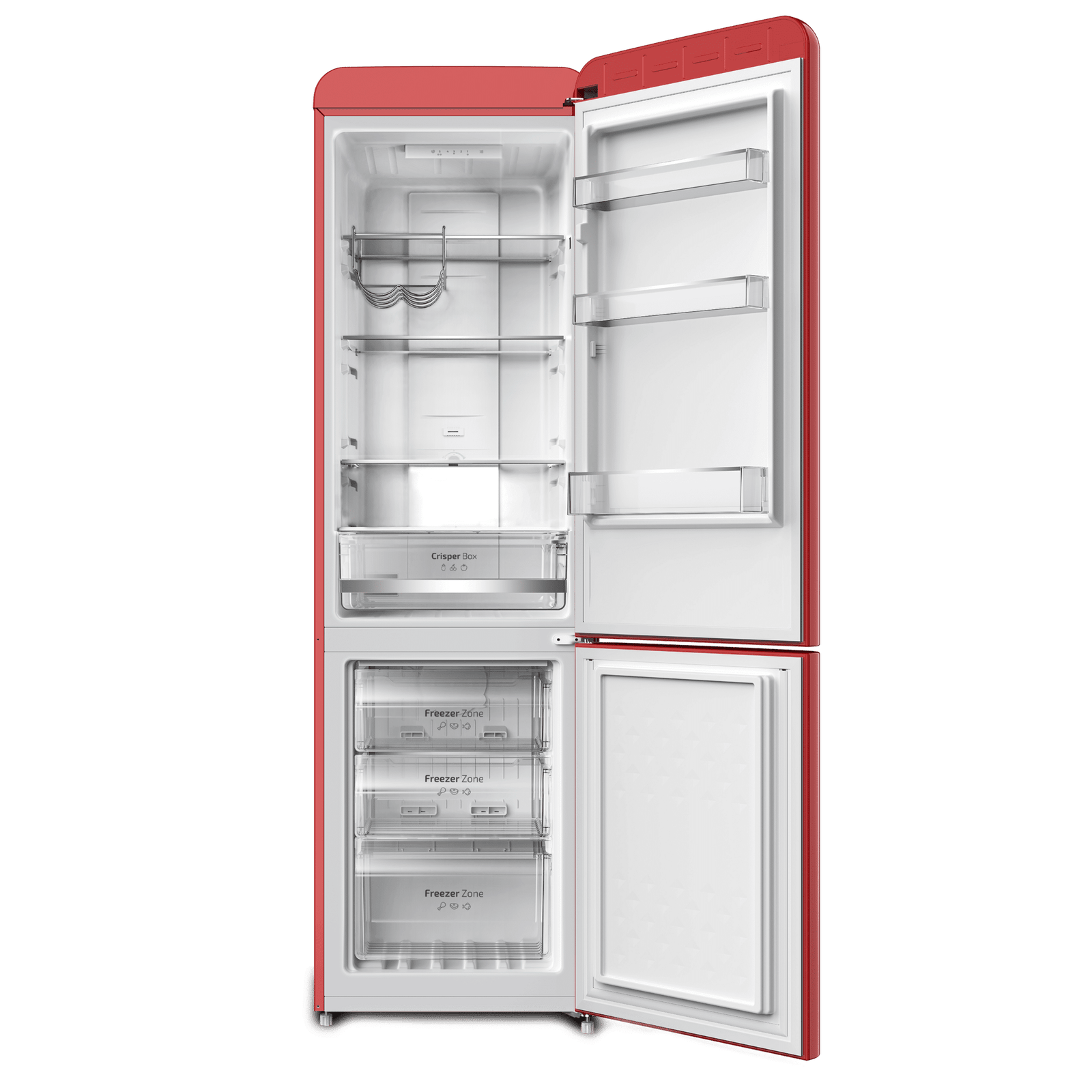Bolero CoolMarket Combi Origin 250 NF Red E Frigorífico combi retro blanco, 186,5cm alto y 54 cm ancho, capacidad 250L, Total No Frost y clase E y con sistema Multi Air Flow. Además, cuenta con el modo Fast Cooling.