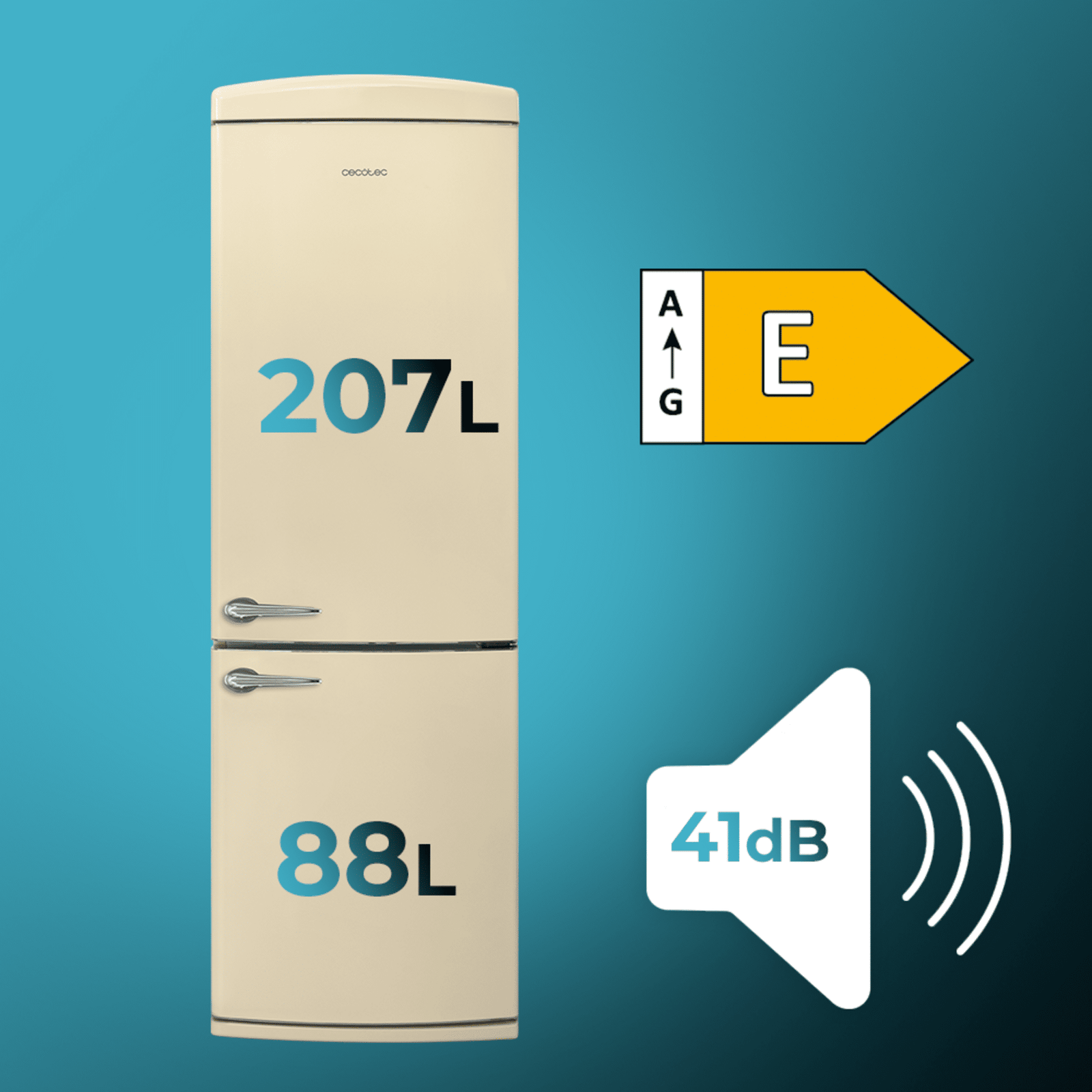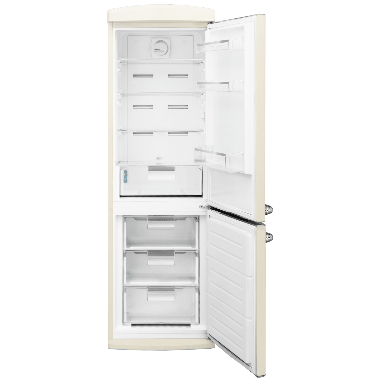 Bolero CoolMarket Combi Origin 294+ Beige E Frigorífico retro combi beige, 190cm de alto y 60 de ancho, capacidad 294L, Total No Frost, clase energética E, Multi Cooling, Ultra Fresh, Convertible Box, Multi Air Flow, Fast Freezing, Modo Eco, Botellero y Alarma en puerta.