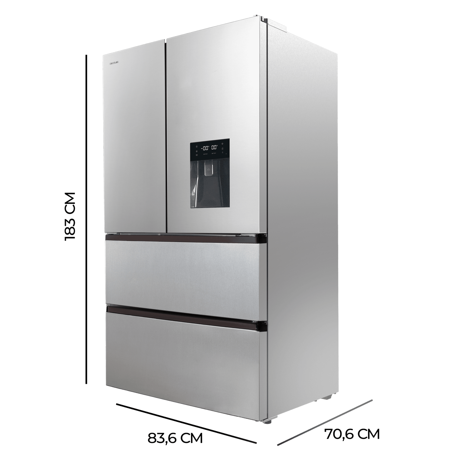 Bolero CoolMarket FD 510 WD Inox E Frigorífico 4 puertas inox estilo francés, con una gran capacidad de 506 L, 183 cm de alto, 84 cm de ancho, con dispensador de agua, clase energética E y compresor inverter plus. Además, cuenta con distintos modos como Fast Cooling y Fast Freezing, así como sistemas como MultiAirFlow, Total NoFrost, Metal Cooling.