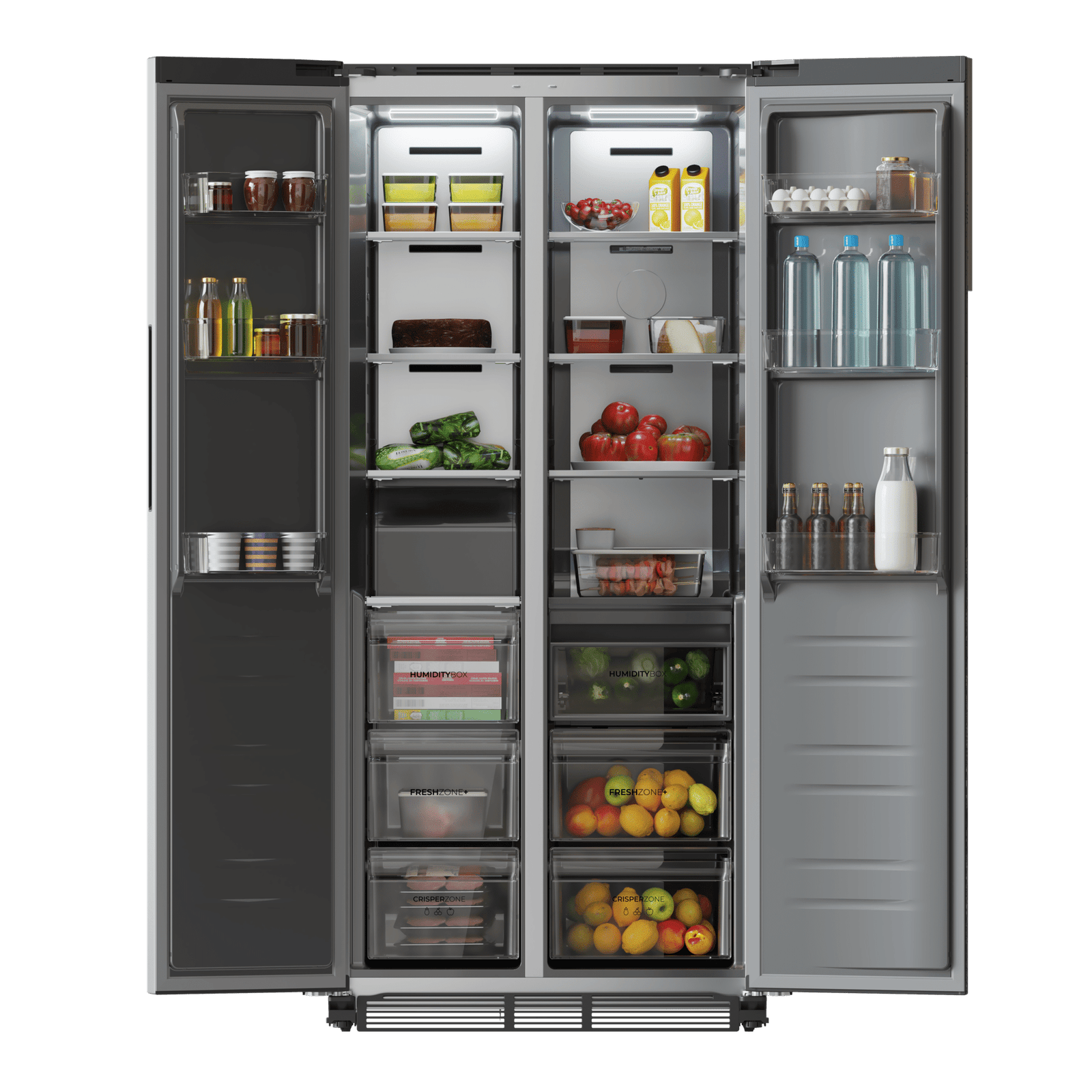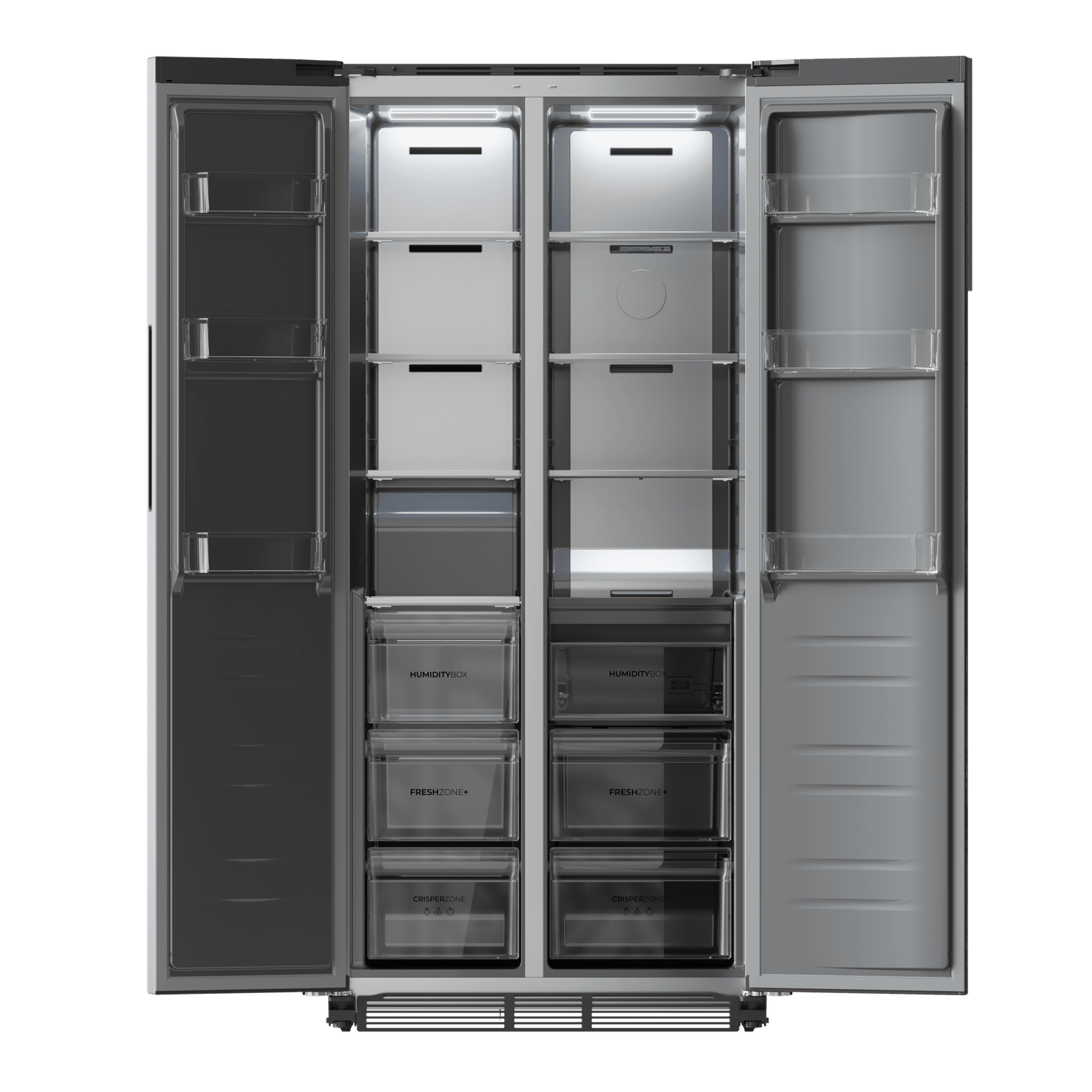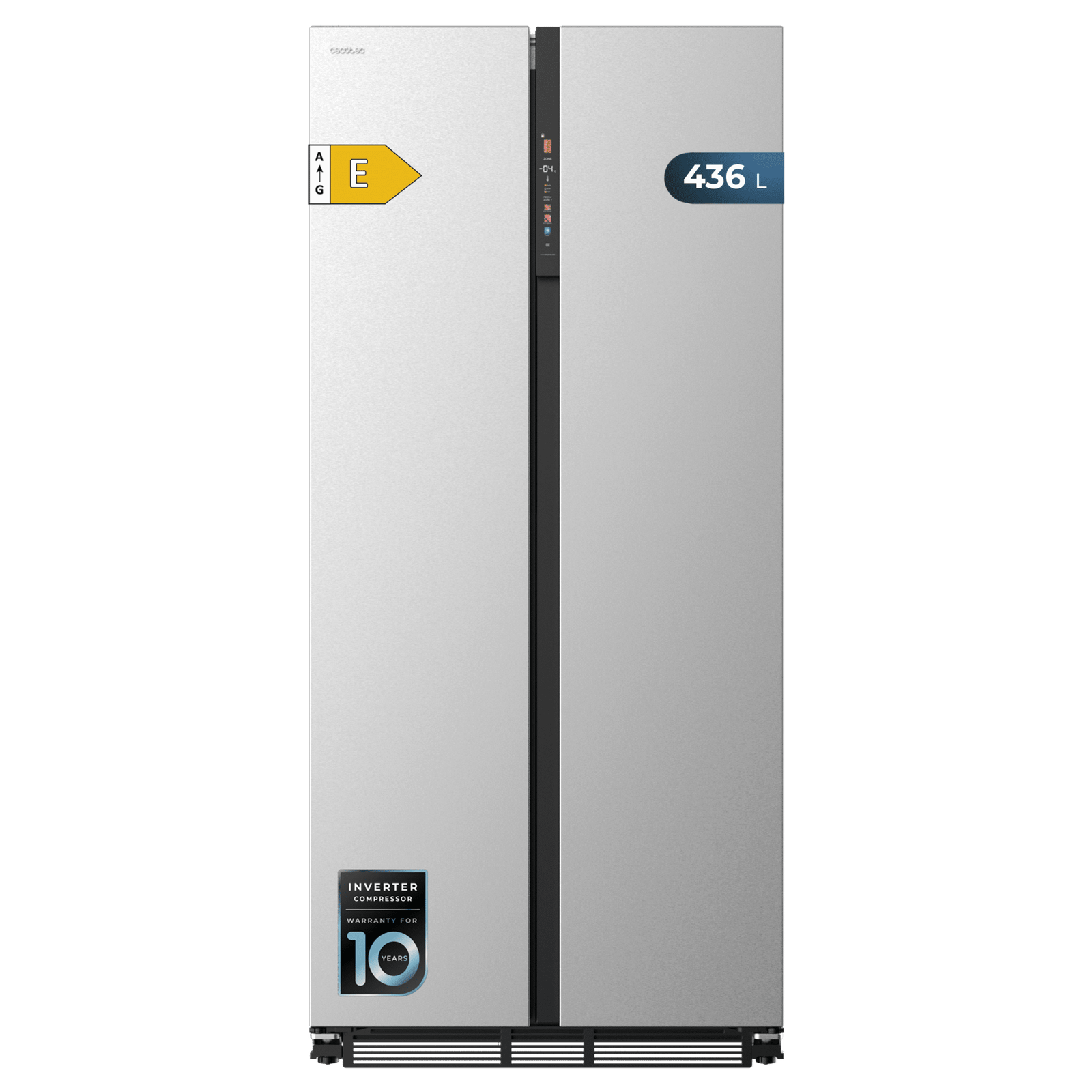 Frigorífico americano acero Inoxidable de 436 L de capacidad, 184,8 x 84,4 cm, clase E, Total No Frost, Compresor Inverter Plus y Multi AirFlow, y con tecnologías Fast Cooling y Fast Freezing, y el Modo Smart y cajón convertible Fresh Zone Plus