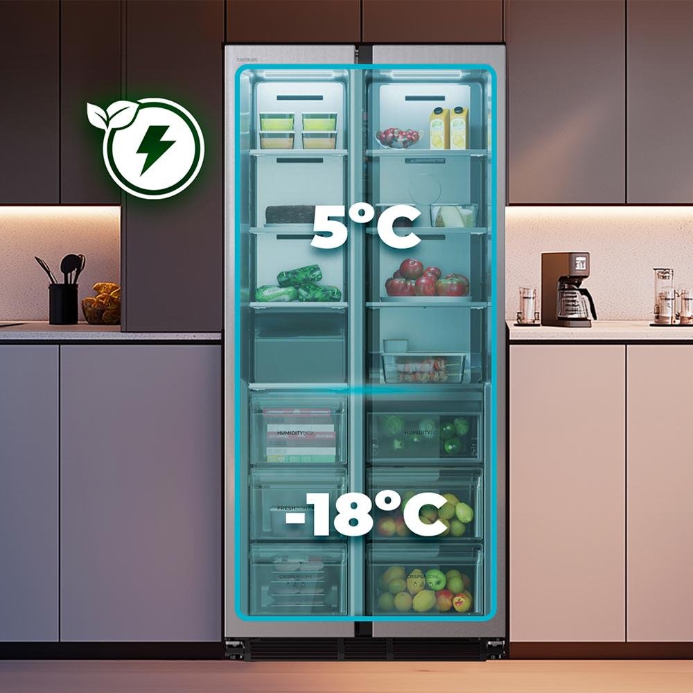Cambia automáticamente la temperatura a 5ºC en el frigorífico y -18ºC en el congelador, reduciendo el consumo energético y manteniendo una excelente conservación.