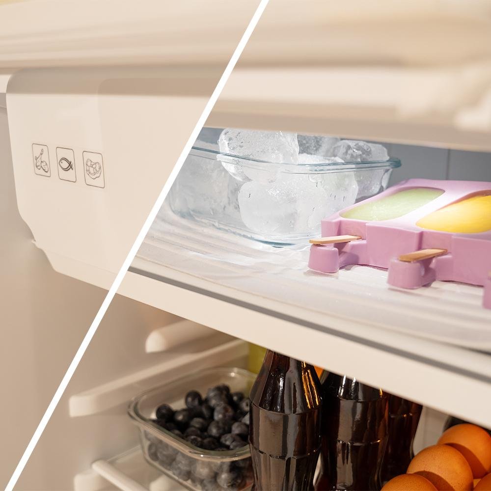 • Icebox: la mini nevera cuenta con cajón para hacer hielo, para que siempre tengas cubitos a tu disposición y puedas enfriar tus bebidas o preparaciones en cualquier momento.