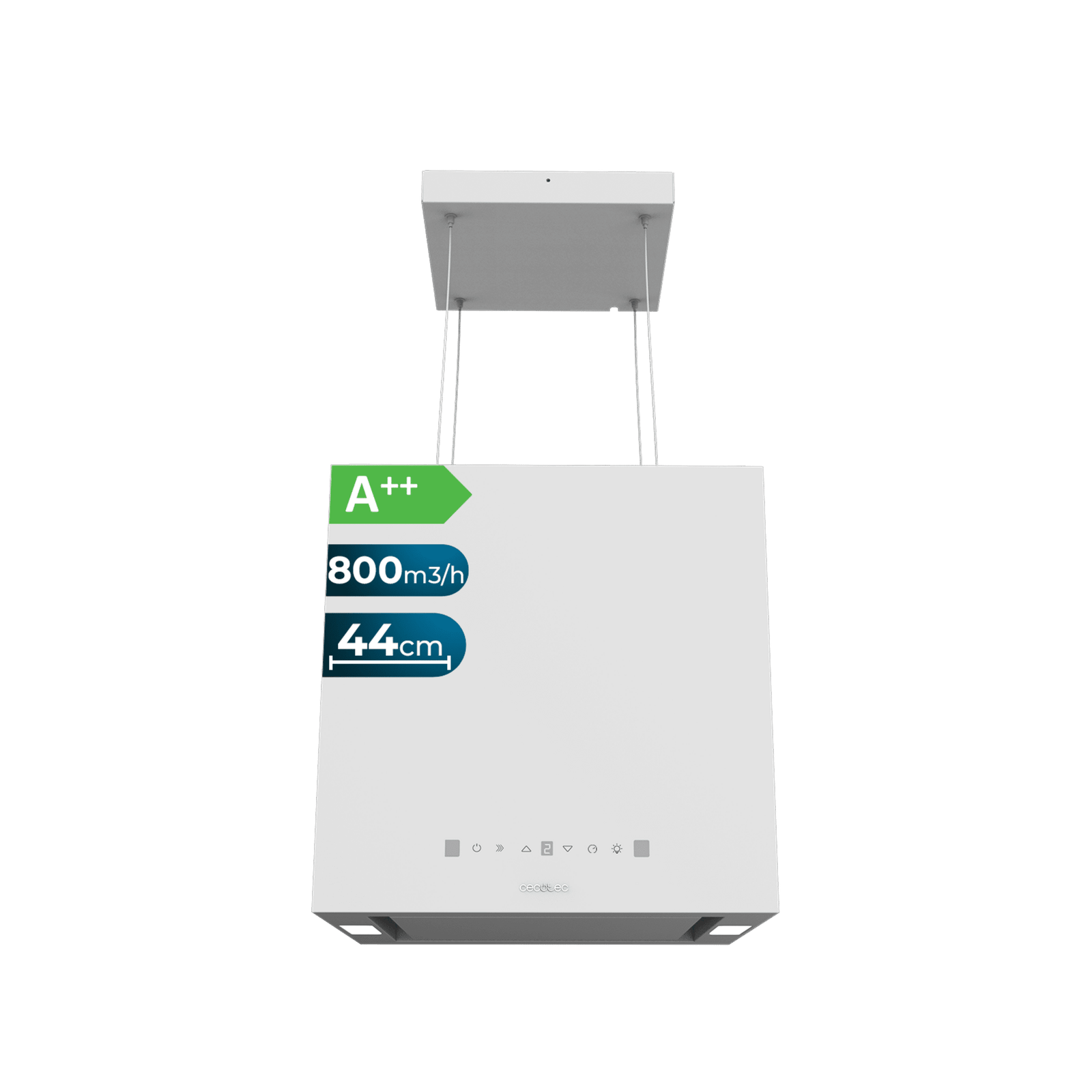 Bolero Flux CCT 448000 White A++ Campana colgante cuadrada de 44cm de ancho, acabado blanco, succión 800m3/h, Motor 210W, Clase A++, control táctil, 3 niveles de potencia, Booster, luz, filtro de carbono, Hand Movement Control y Delay Function.