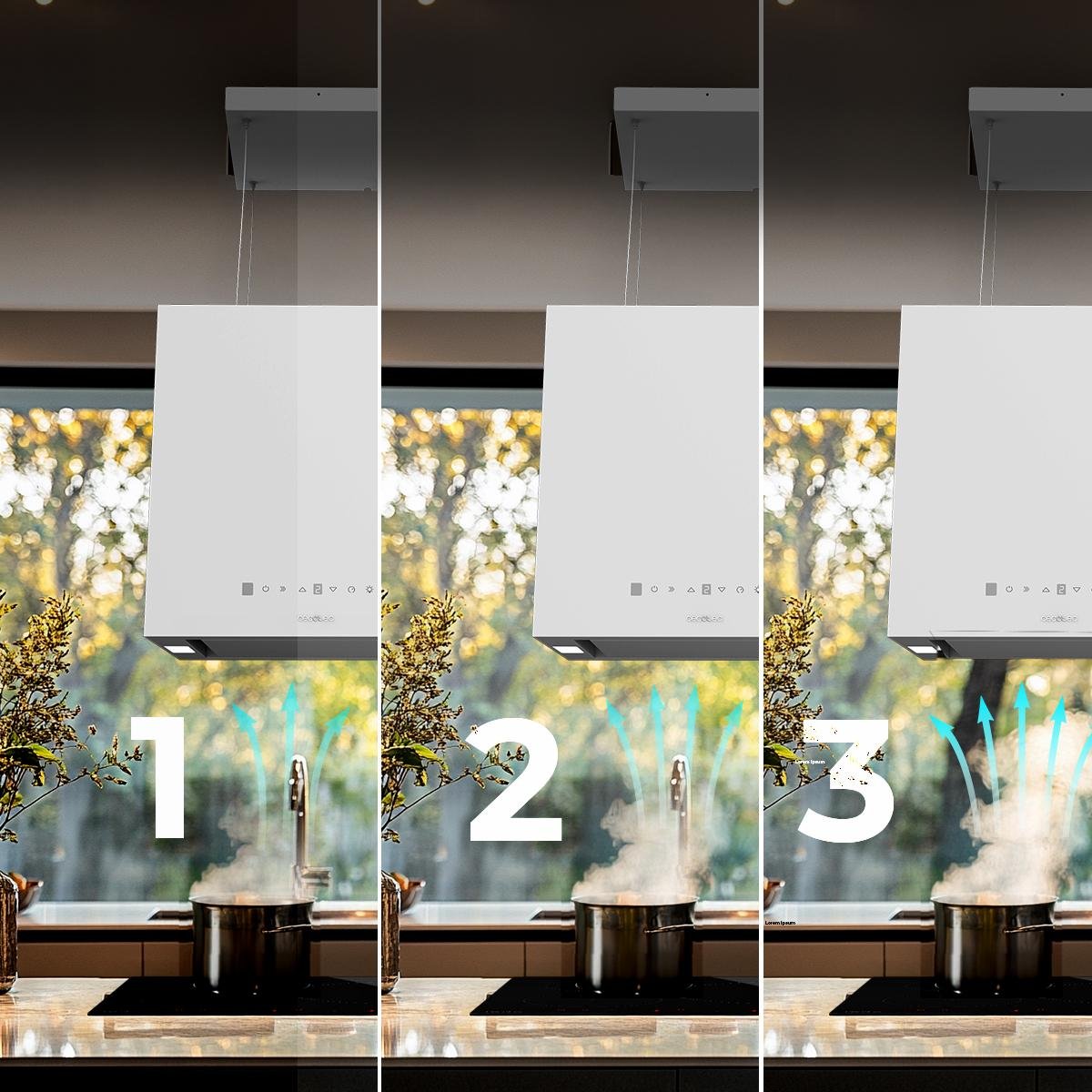 Con 3 niveles de potencia y función Booster, esta campana se adapta a cualquier necesidad, ofreciendo una succión rápida y potente al instante. Además, su sistema de luces LED no solo indican su funcionamiento, sino que también realzan el estilo y visibilidad en la cocina.