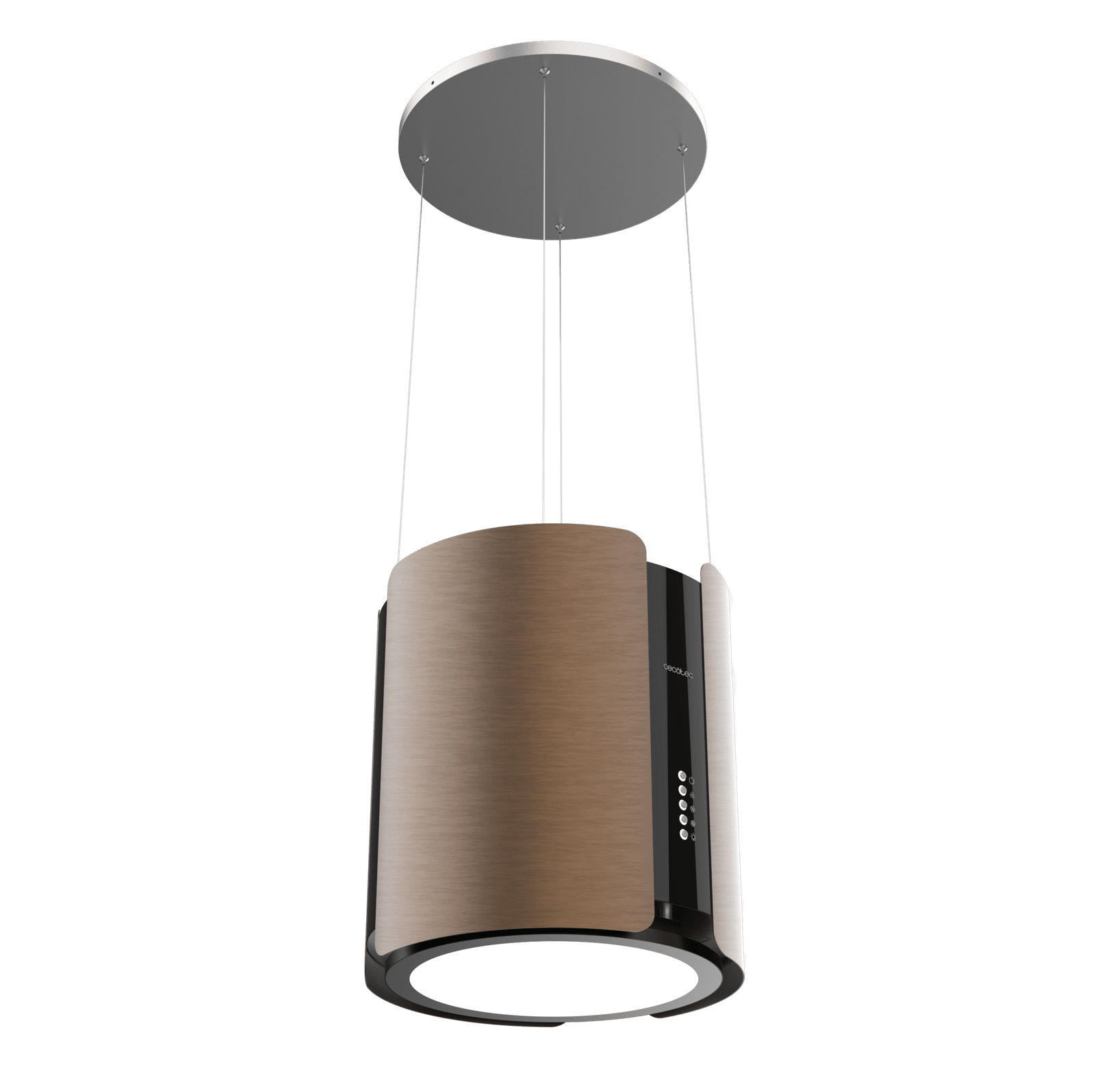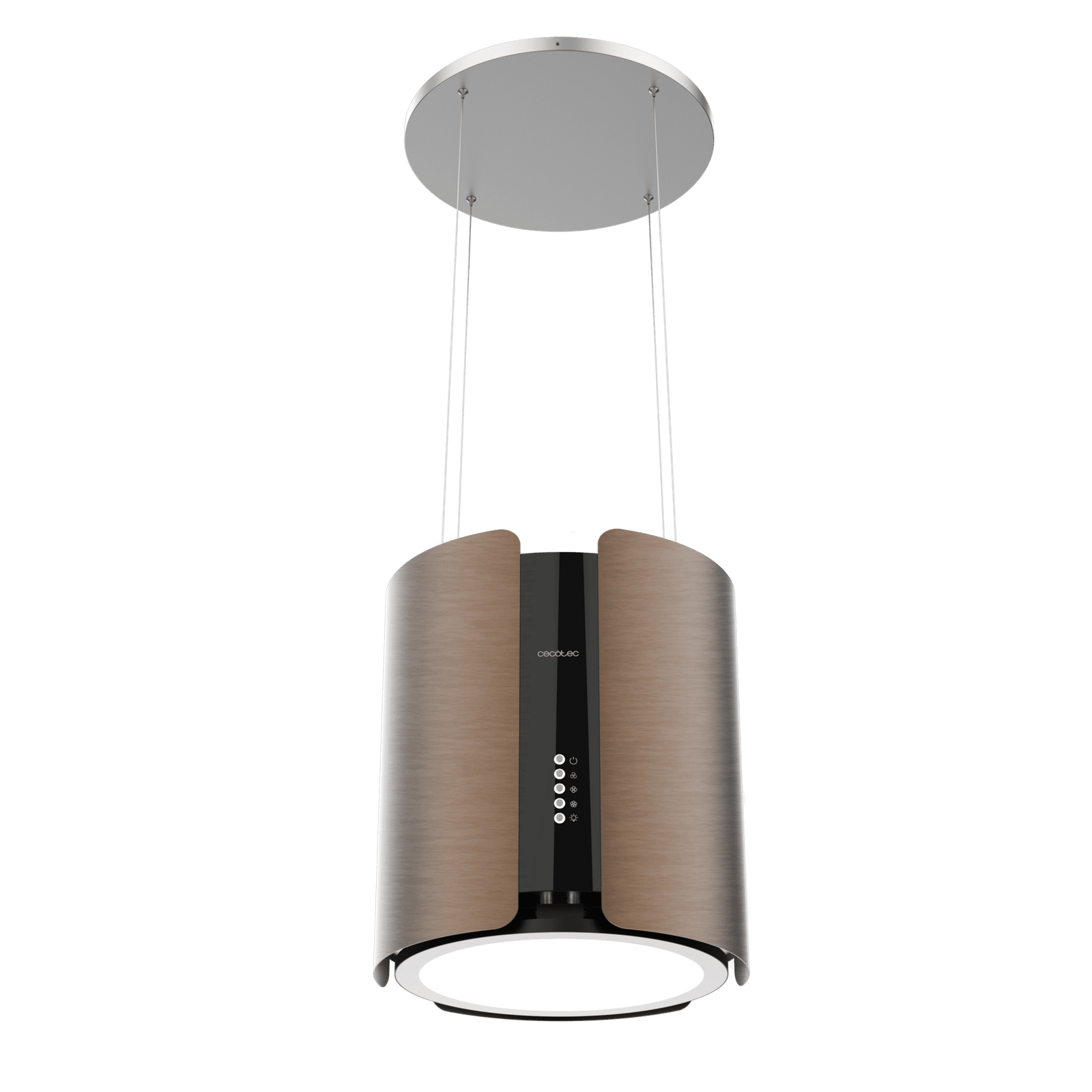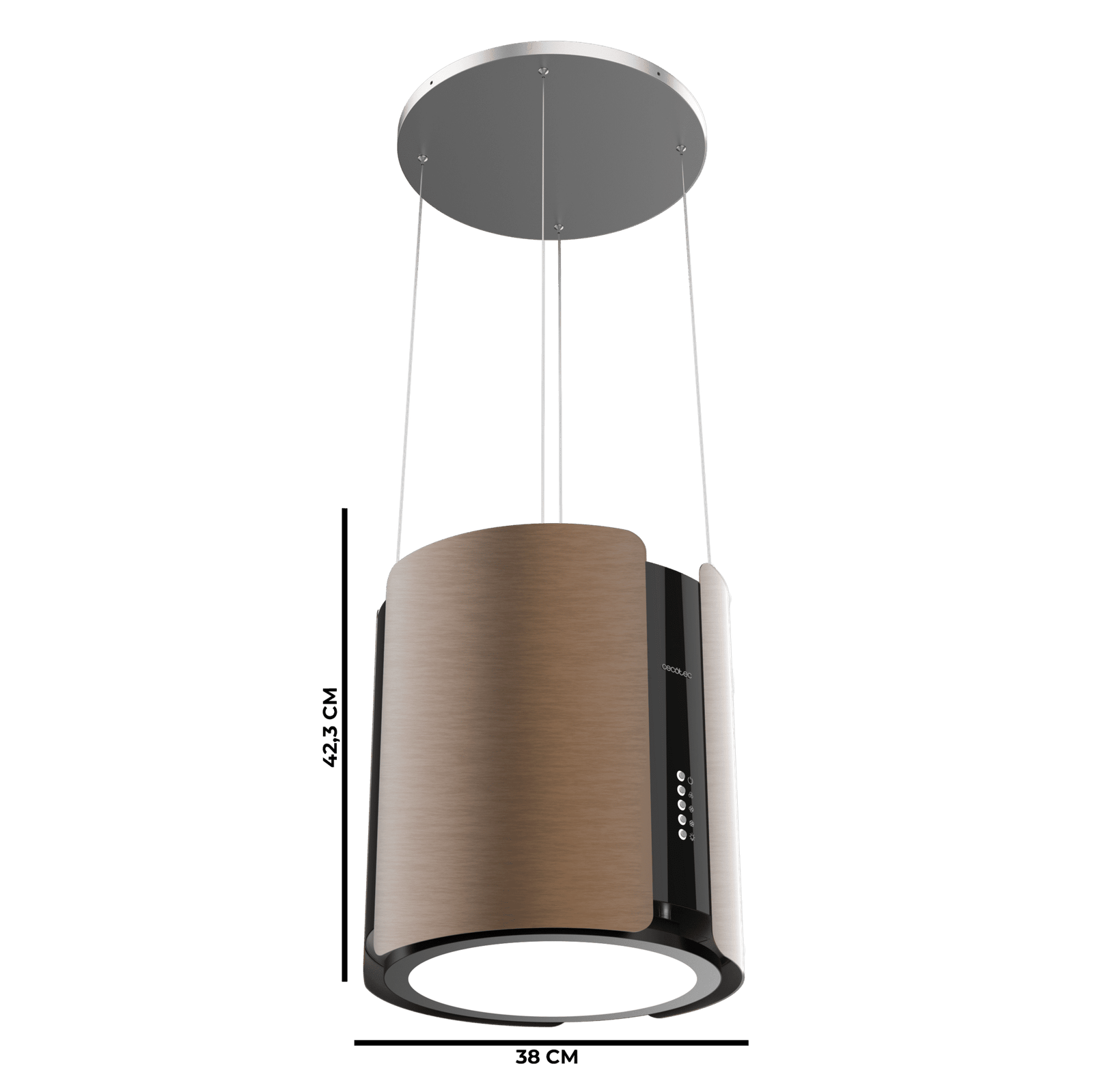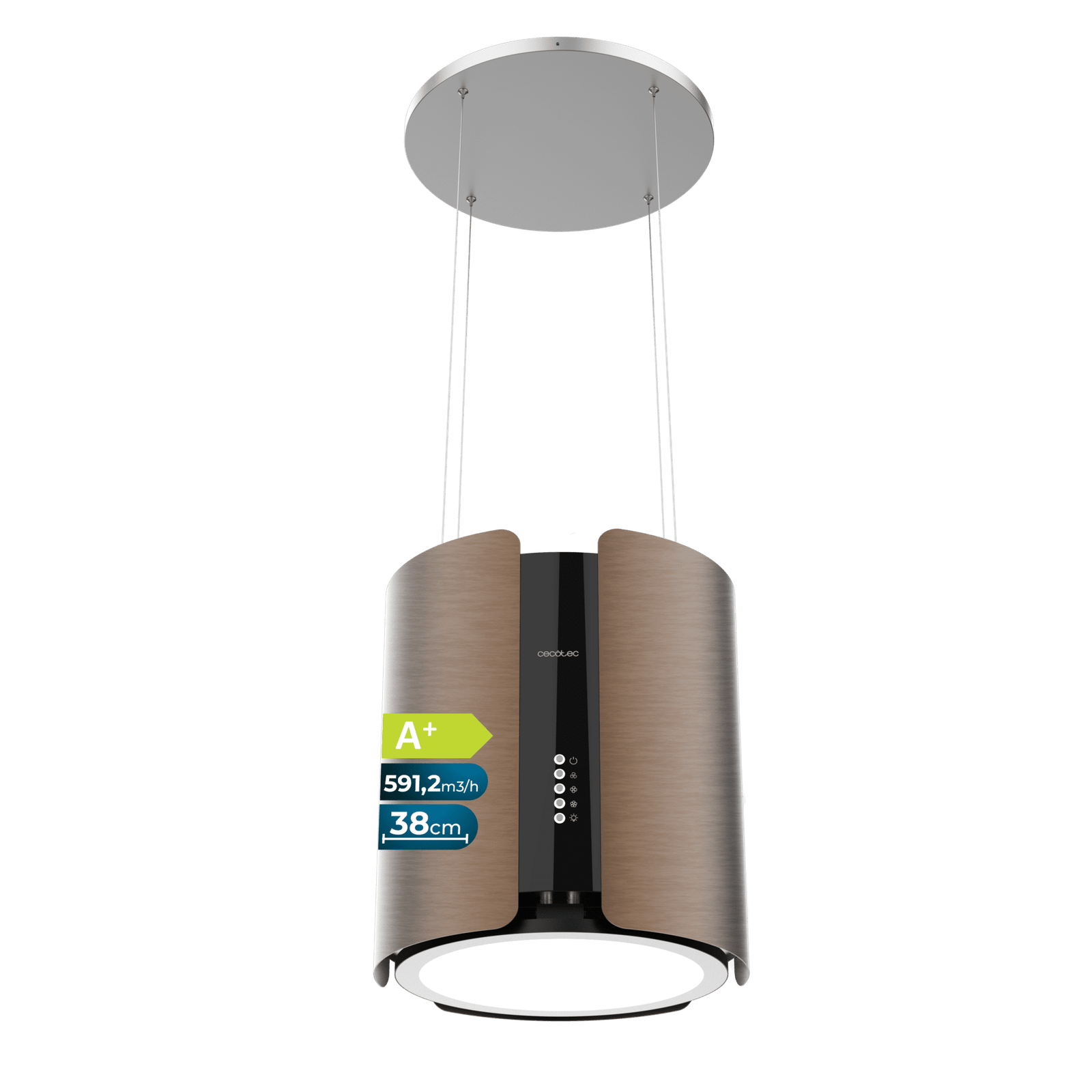 - La Cecotec Bolero Flux CRE 385500 Cooper A+ está diseñada como una campana isla colgante redonda de 38,5 cm de diámetro, aportando un estilo moderno y elegante que se convierte en el centro de todas las miradas en tu cocina.