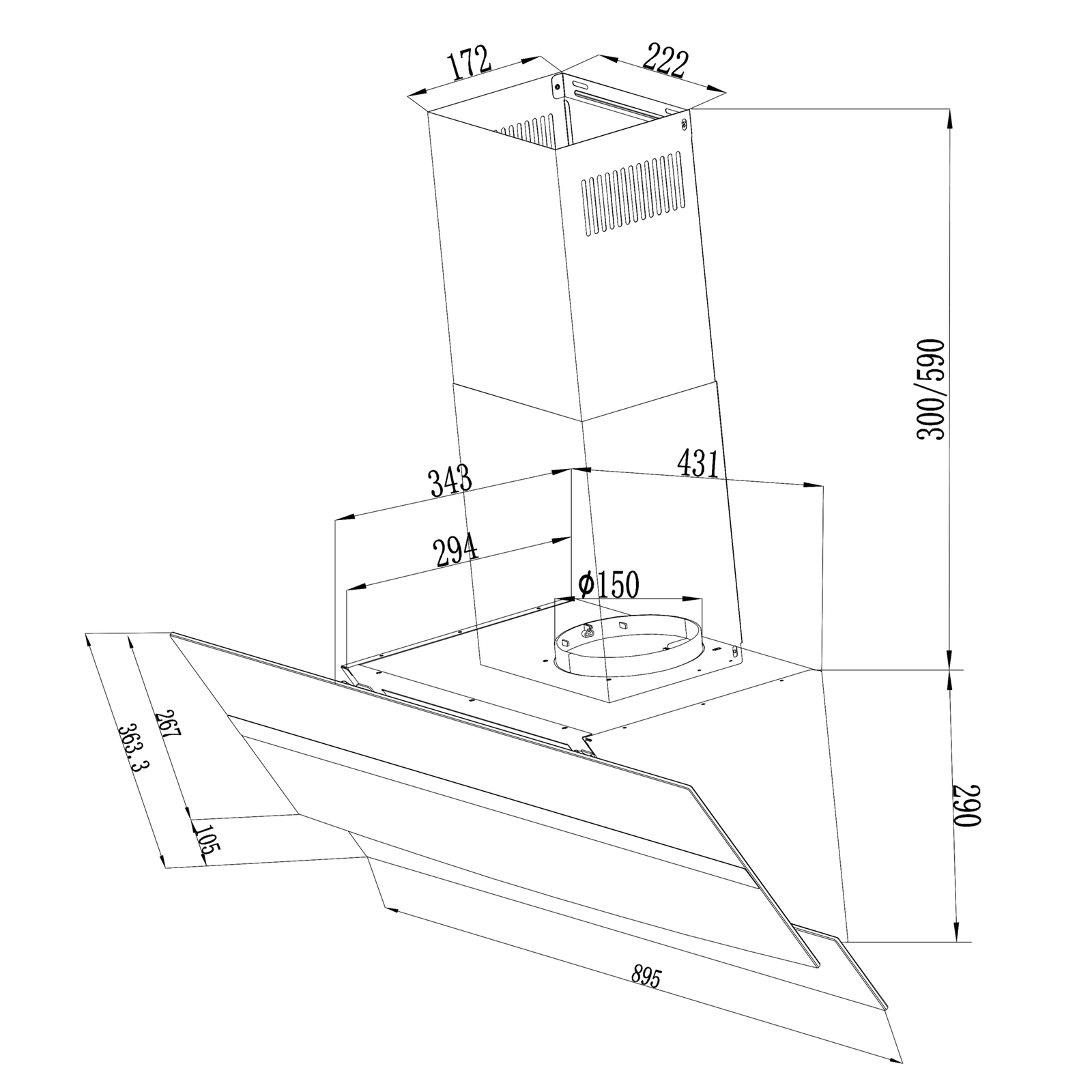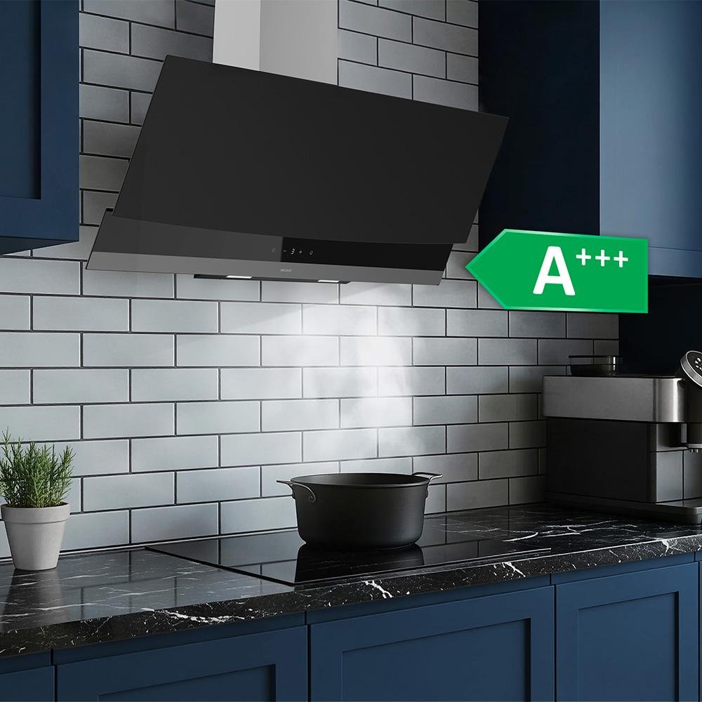 - Diseño innovador y resistente. Campana de acero inoxidable de 90 cm de ancho, con cristal frontal negro mate de fácil limpieza, que se adapta a cada estilo de cocina.