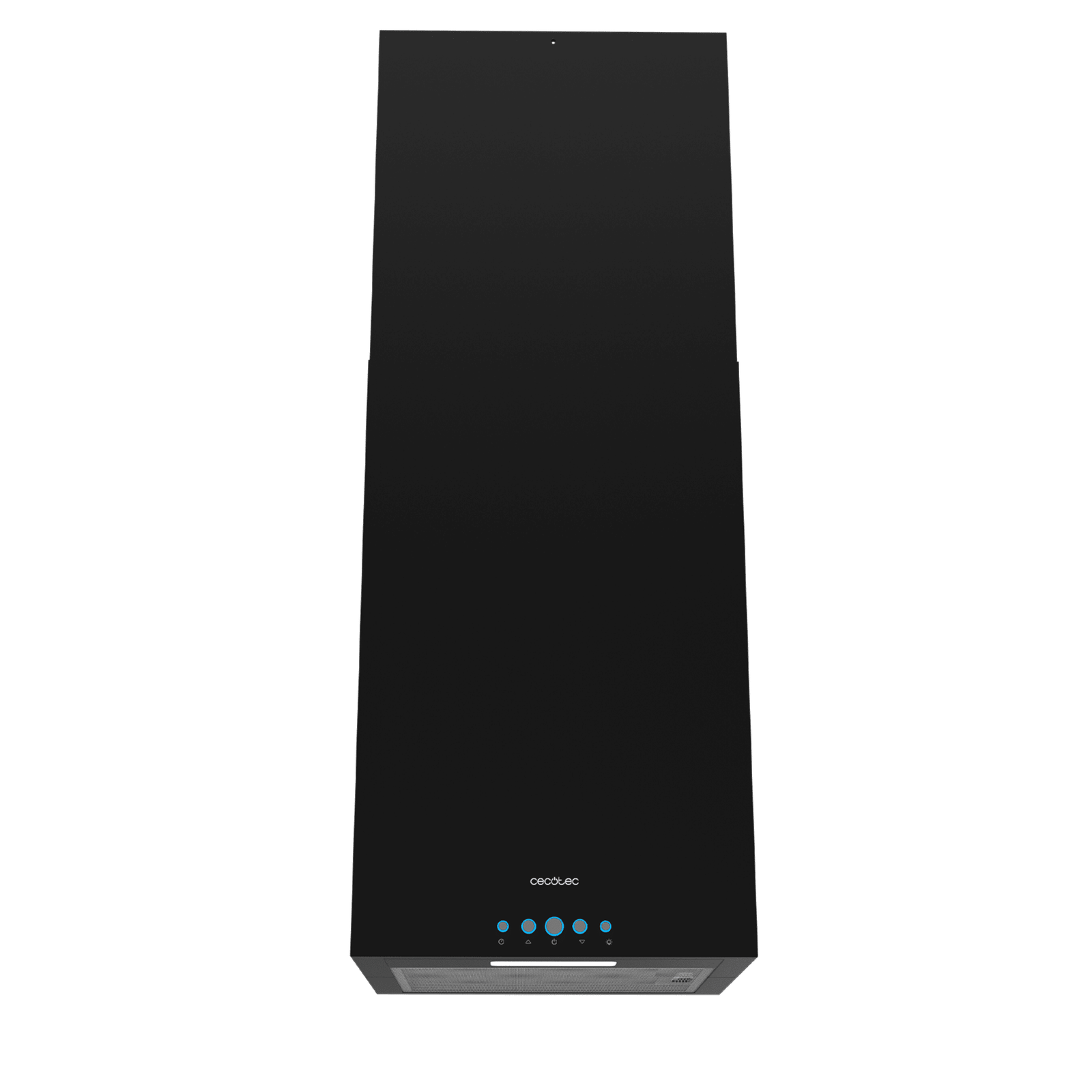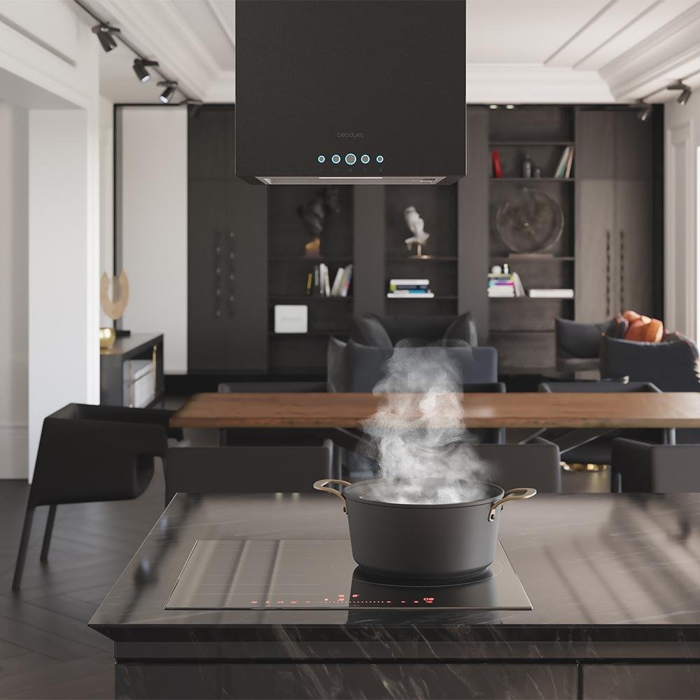 Bolero Flux ICT 388000 Black A++ Campana isla cuadrada de ancho, acabado negro, succión 800m3/h, Motor 210W, Clase A++, control electrónico, 3 niveles de potencia, luz, filtro de carbono y Delay Function.