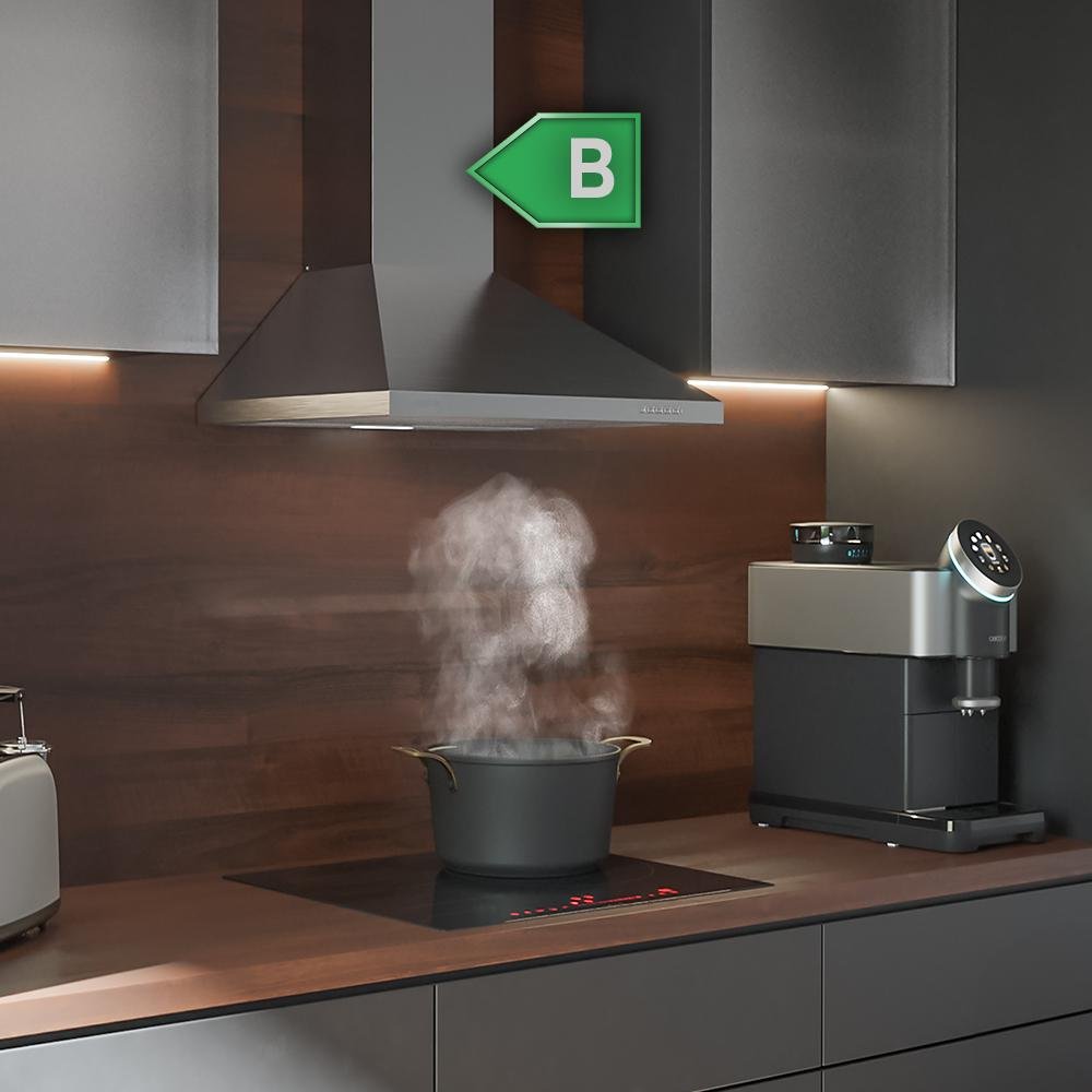 La campana pirámide de 60 cm de ancho está diseñada con mucha clase, tanto por su estilo con acabados en acero inoxidable como por su eficiencia energética B, lo que permite ahorrar a diario al mismo tiempo que ofrece un gran rendimiento.