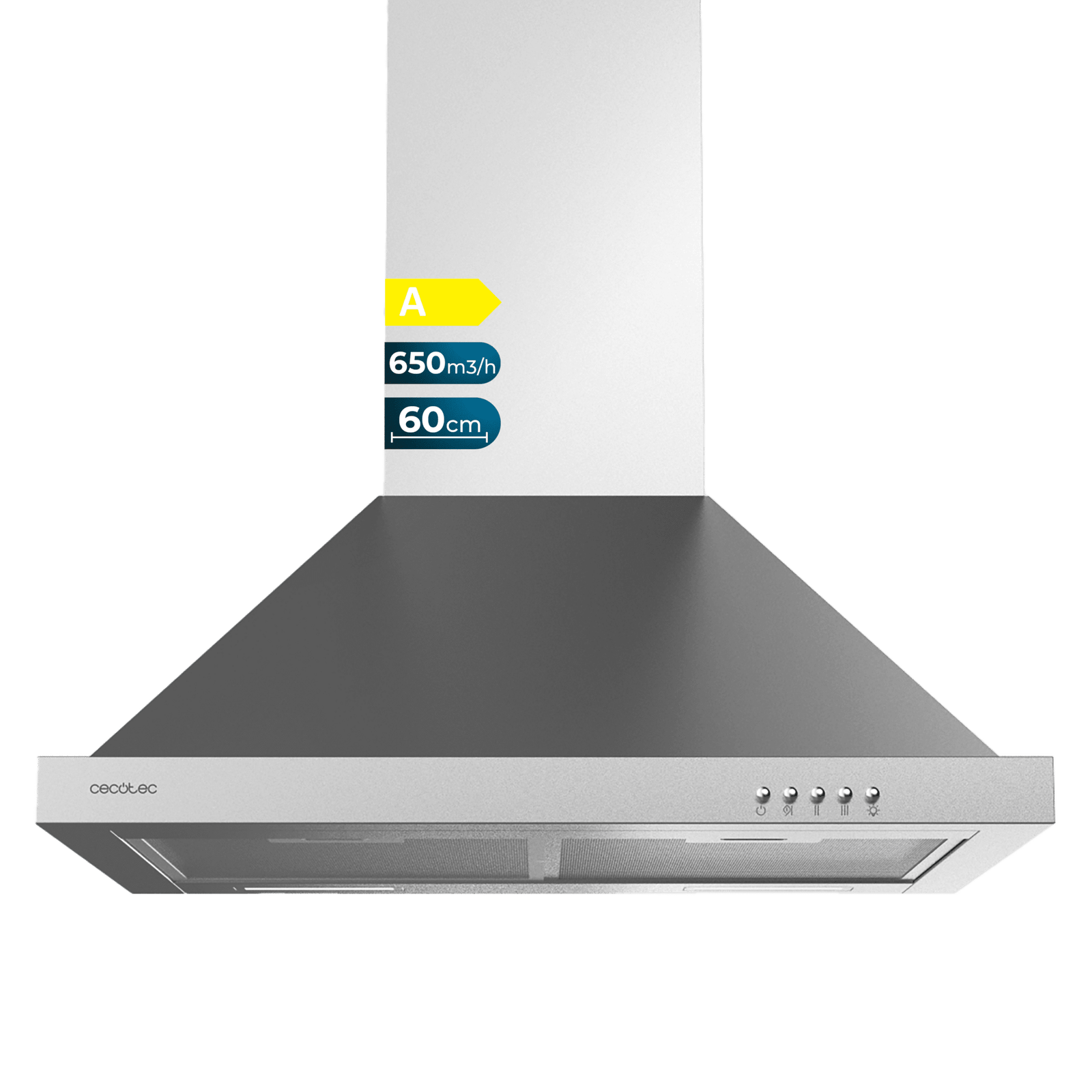 Bolero Flux PM 606500 Inox A Campana piramidal de 60cm de ancho, acabado inox, succión 650m3/h, Motor 165W, Clase A, control mecánico, 3 niveles de potencia, luz y filtro de carbono.