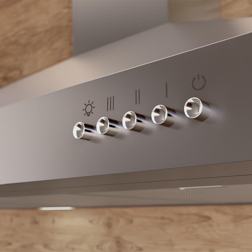 • Control mecánico: selecciona manualmente entre las diferentes funciones que ofrece la campana extractora, de manera fácil e intuitiva.