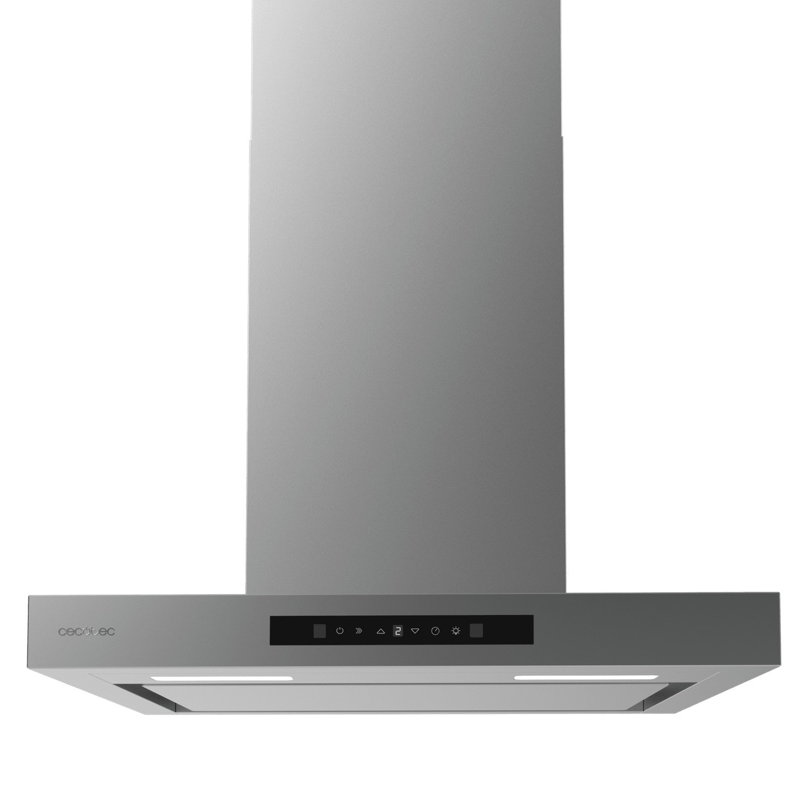 - Acabado inoxidable: campana extractora con acabados de acero inoxidable, que aporta resistencia y dureza a la estructura, y display táctil glass black.