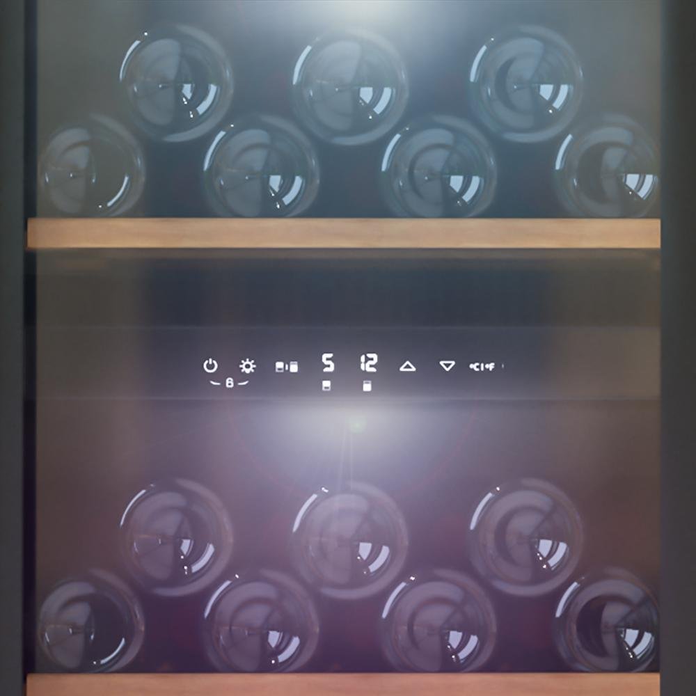 Vinoteca de 77 botellas de capacidad con sistema compresor de enfriamiento que garantiza un alto rendimiento, ofreciendo una doble zona, tanto para vino tinto, como blanco o champagne. Temperatura regulable y luz LED interior.
