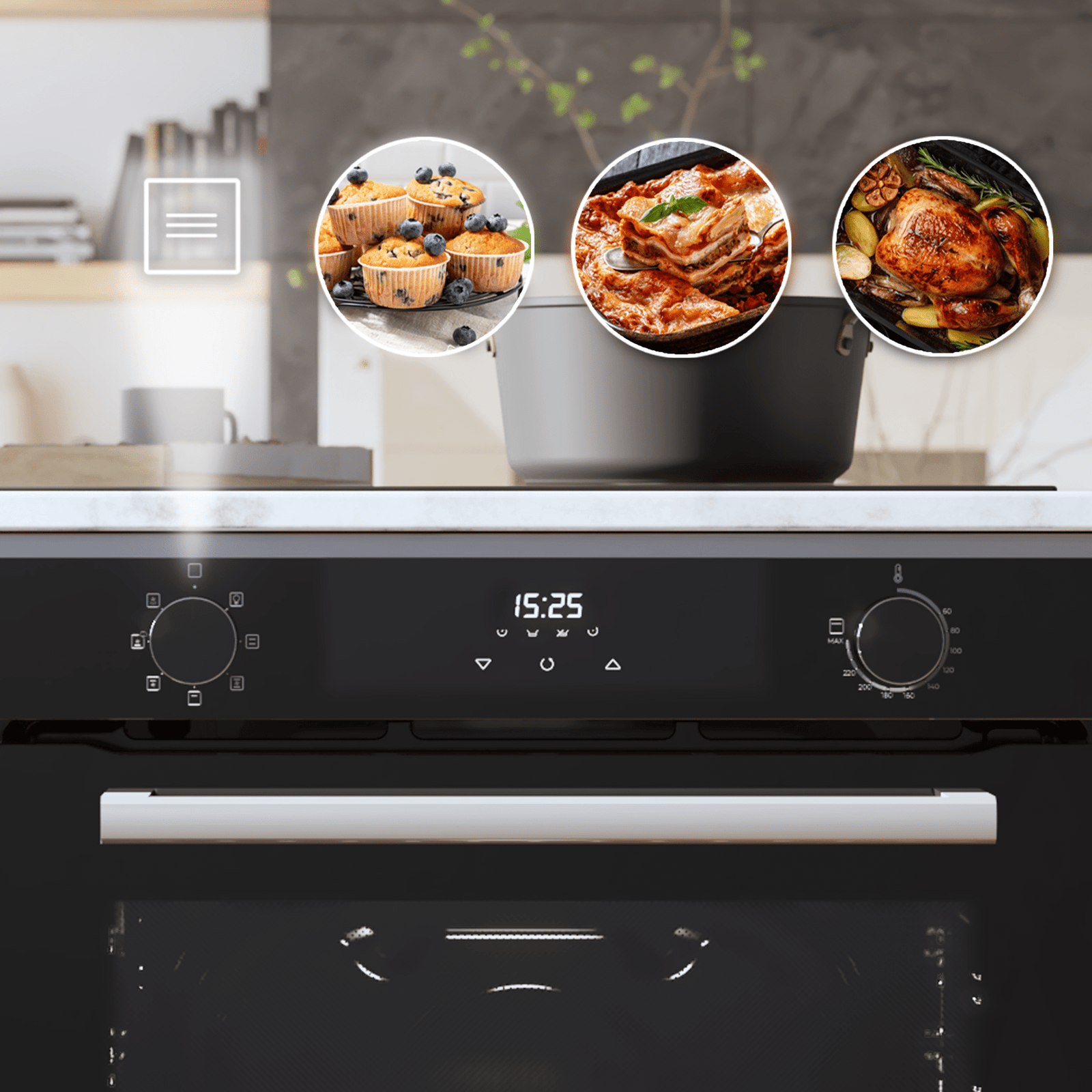 Disfruta de sus 7 funciones (Luz interior, Modo Grill, Fan Assisted Grill, Modo Convección, Defrost, Fast Cooking, Steam Assist y Steam EasyClean) y cocina sin límites con un solo toque gracias a su display táctil.