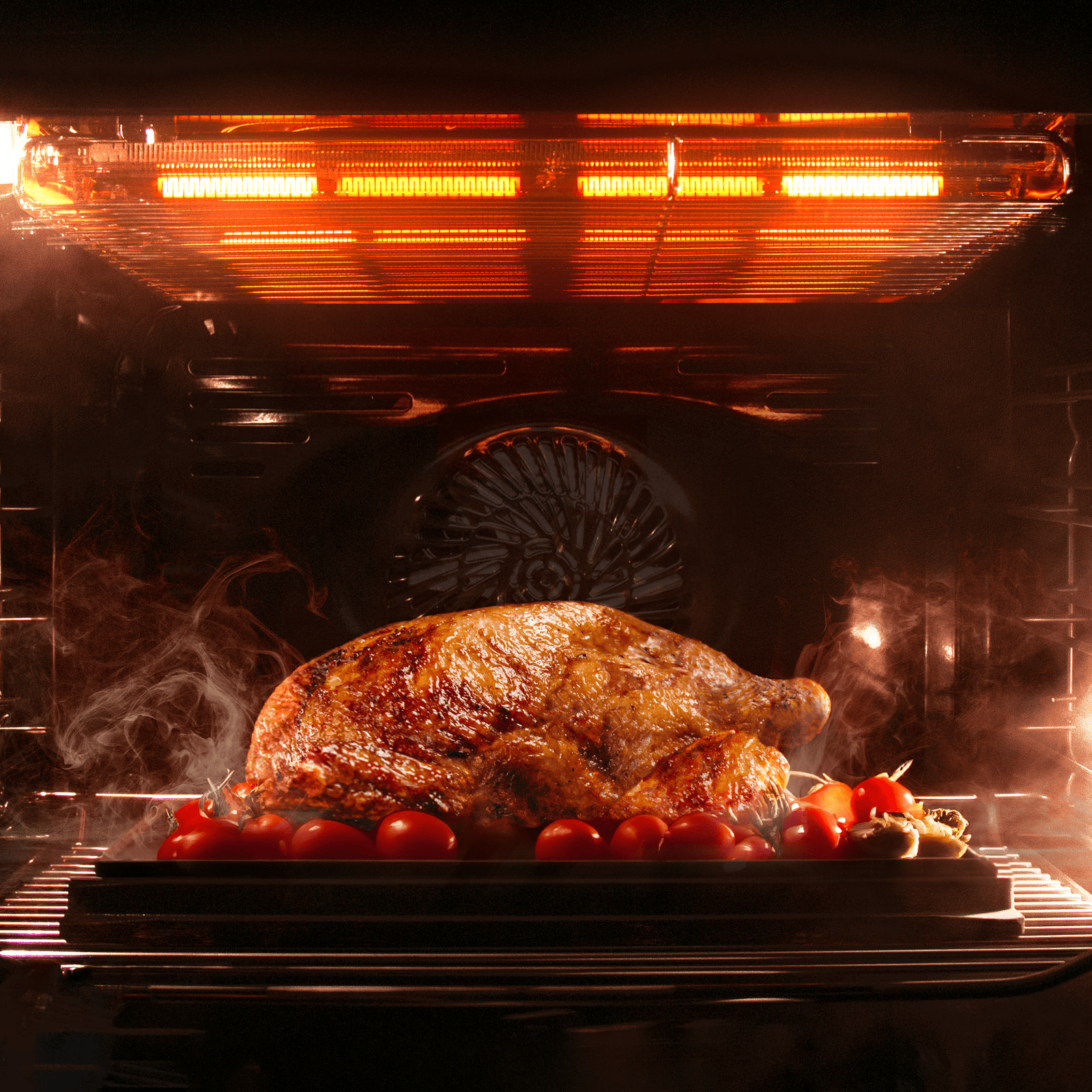 La gama de hornos Steak Master cuenta con acabados premium inox y cristal a juego con microondas y calientaplatos para integrarse a la perfección en cualquier cocina y darle un toque sofisticado.