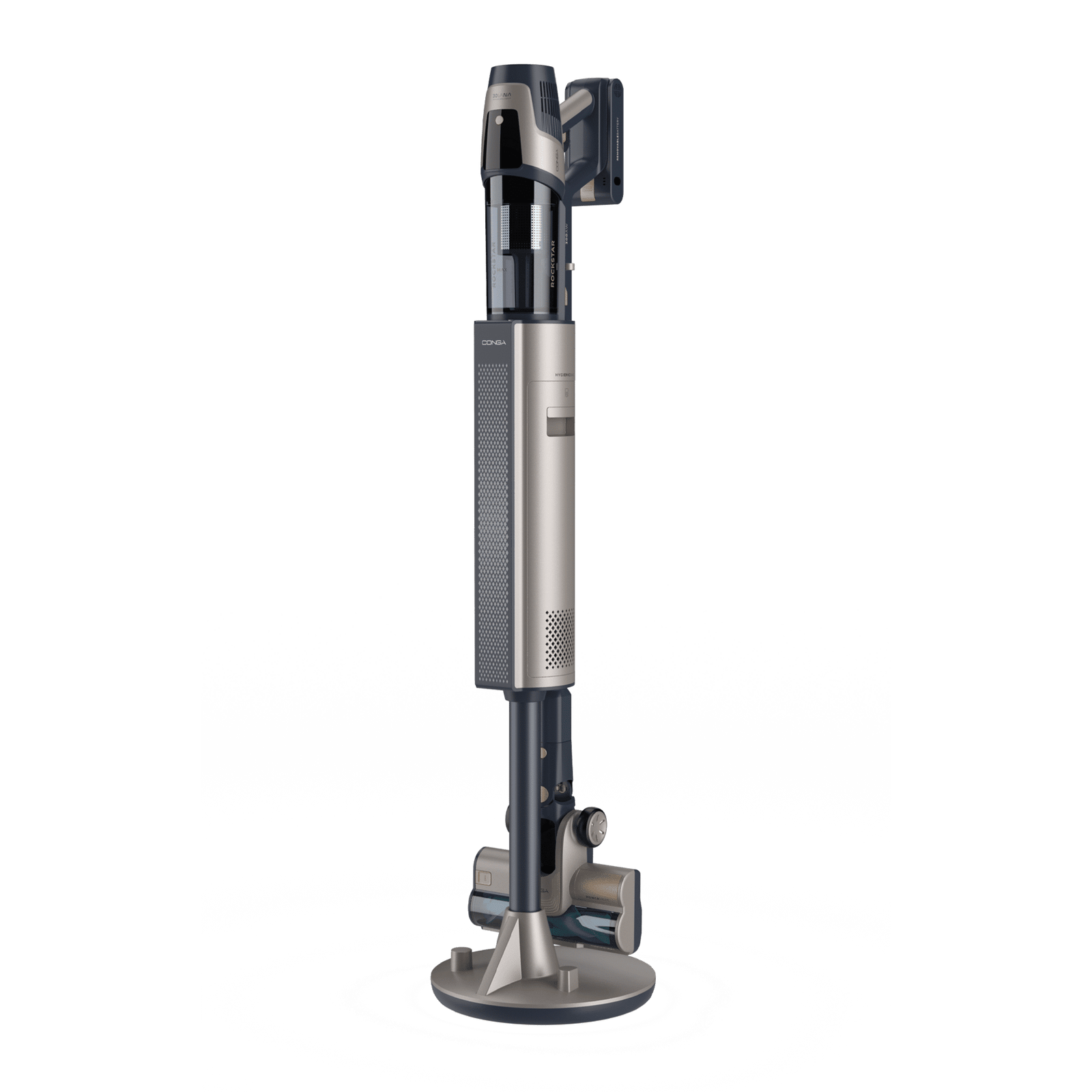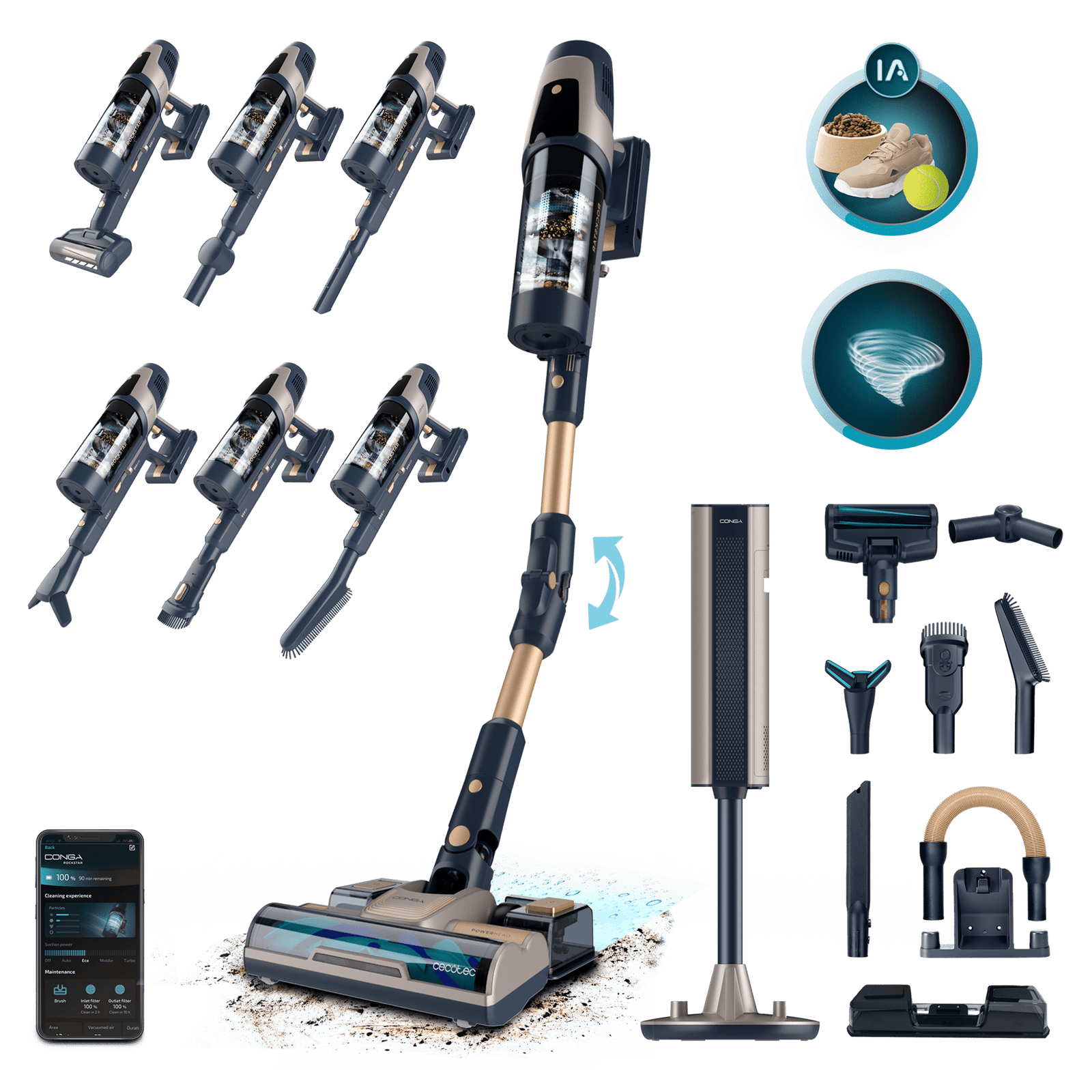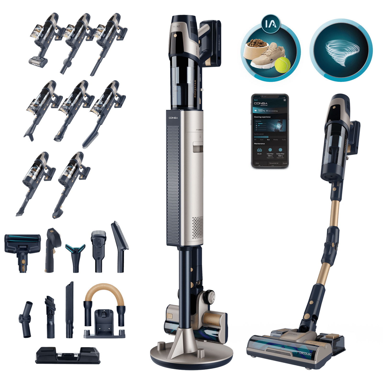 Conga Rockstar 11490 Odyssey Station Connected IA Aspirador escoba sin cable con base de autovaciado. 300 AW y 850 W. Tubo flexible. Inteligencia Artificial y contador de partículas. APP. Cepillo de animales y accesorio WaterTank de fregado.
