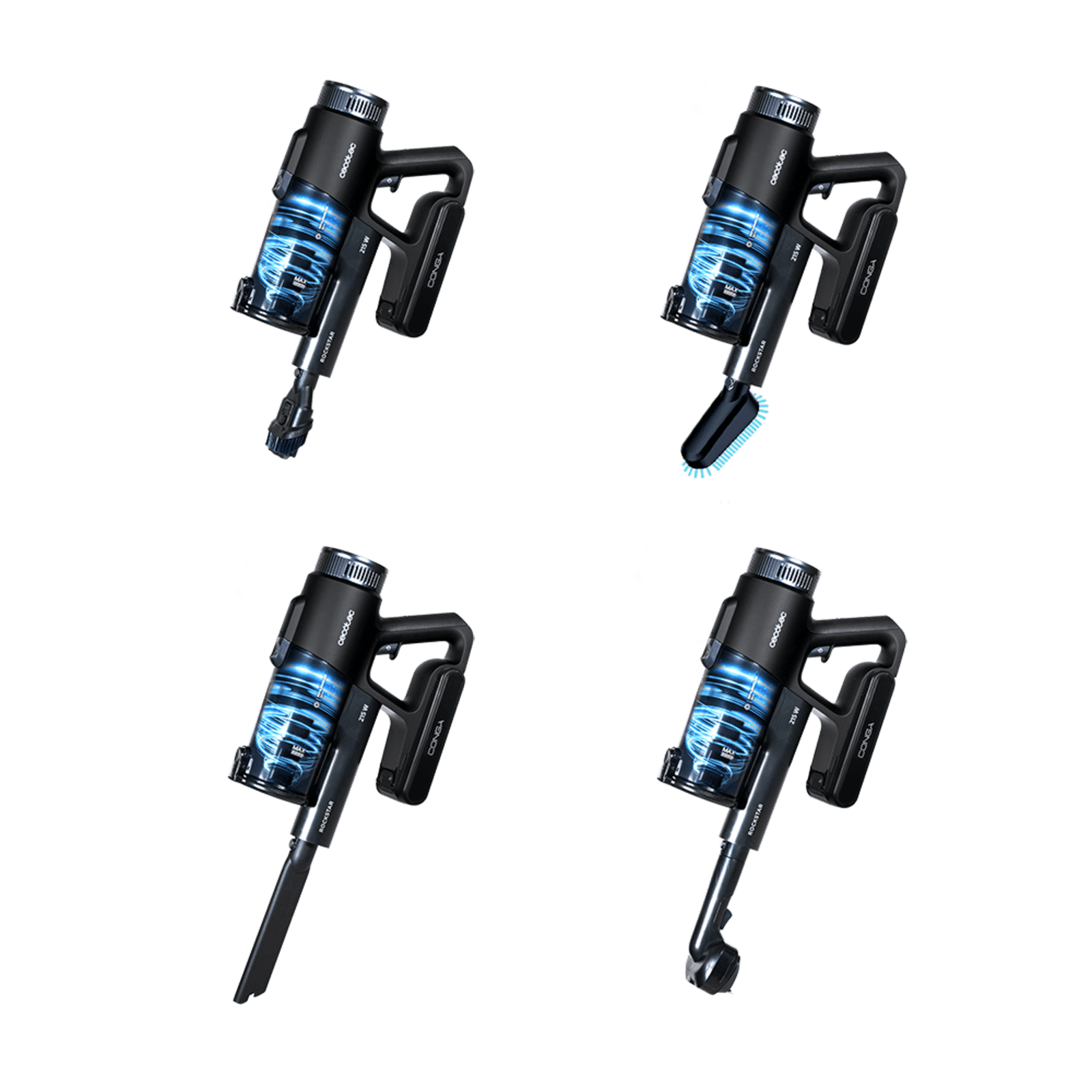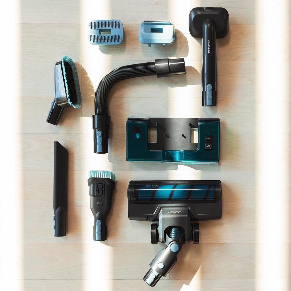 Conga Rockstar 1500 Ray Ergowet Animal Aspirador escoba sin cables sin bolsa 3 en 1 con ciclón paralelo. Potencia 215 W y 12 kPa. 60 minutos de autonomía. Tubo flexible, cepillo Jalisco y depósito de 500 ml. Además de un accesorio alargado para muebles, accesorio para animáles y water tank.