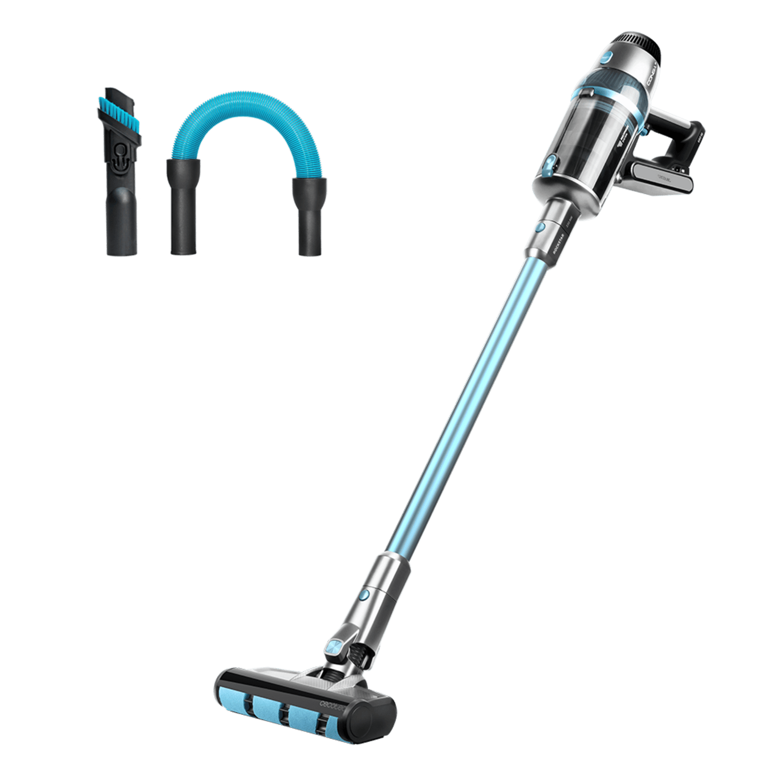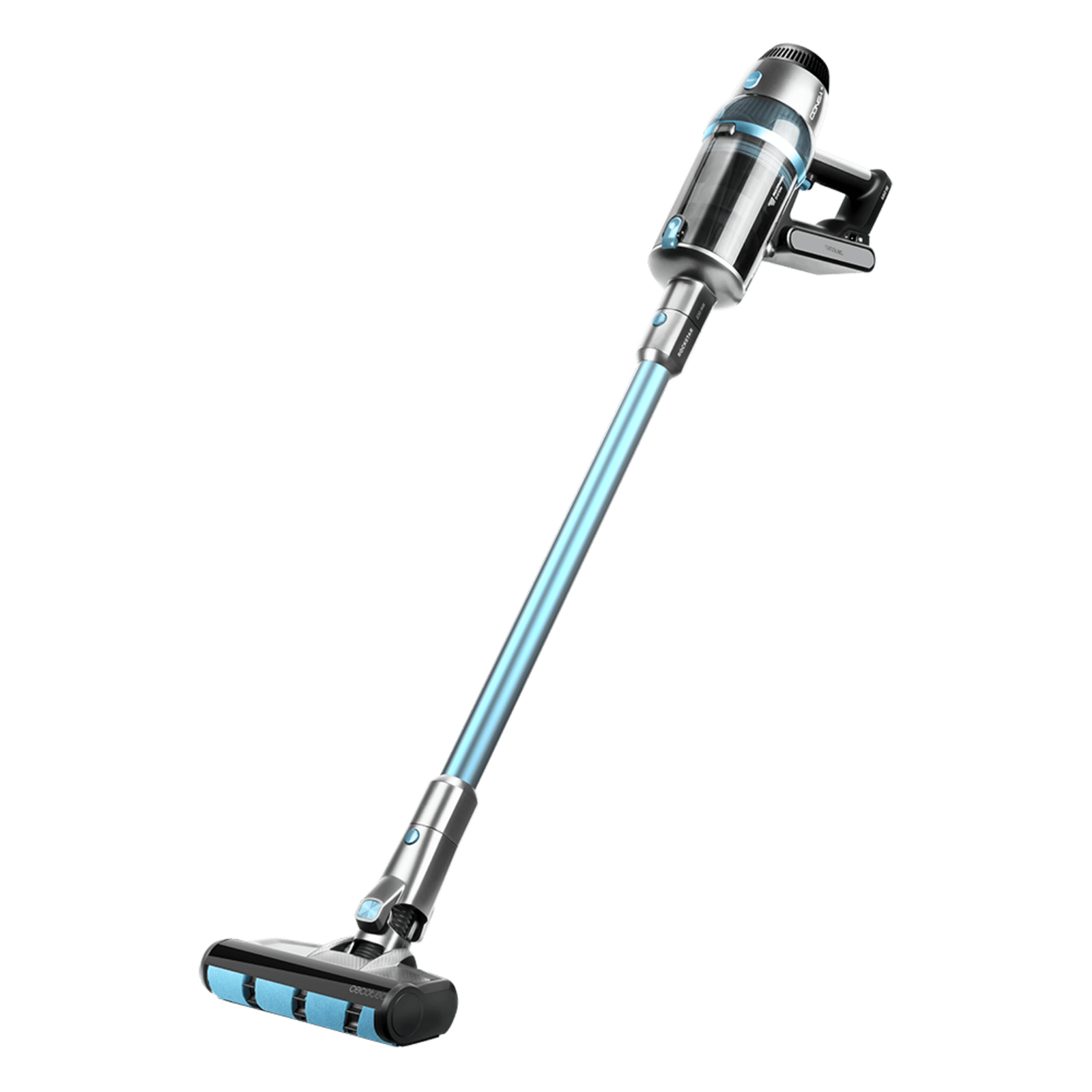 Incluye: accesorio 2 en 1 estrecho para muebles y esquinas y tubo extensible. 1. Según pruebas realizadas conforme a la cláusula 5.8 de la normativa IEC 62885-4:2020. 2. Según pruebas internas de Cecotec. 3. En modo Eco con uso de accesorio no motorizado.