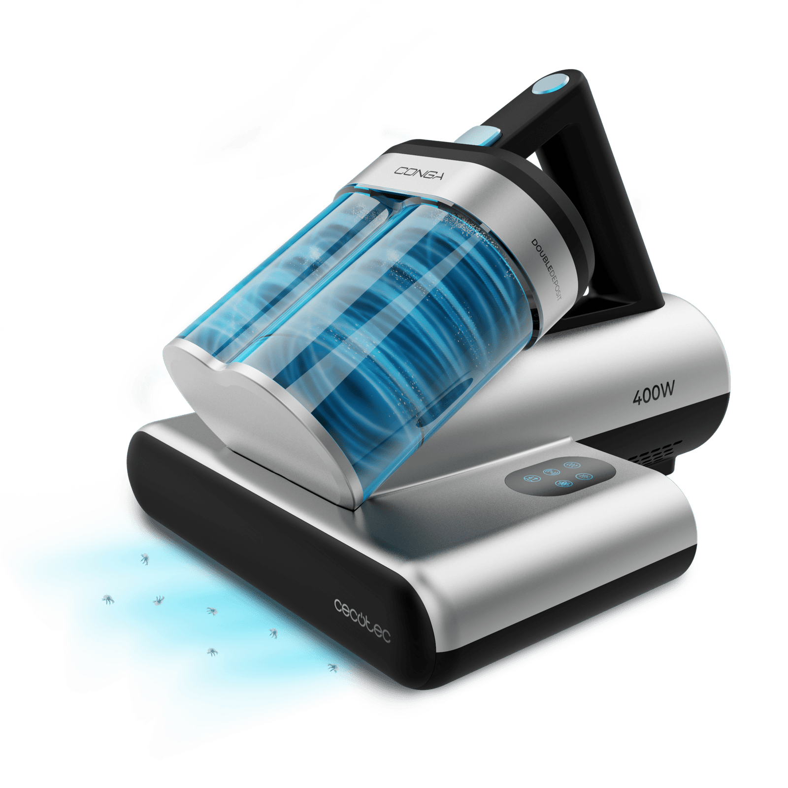 Conga Rockstar 4000 Mattress Aspirador de colchones y tapicerías con 400 W de potencia y 13 kPa de poder de succión. Incluye luz ultravioleta UV-C que acaba hasta con el 99,9 % de los alérgenos. Tecnología con cepillo motorizado que ayuda a eliminar los ácaros de los colchones y tecnología de aire caliente que desinfecta. Depósito doble
