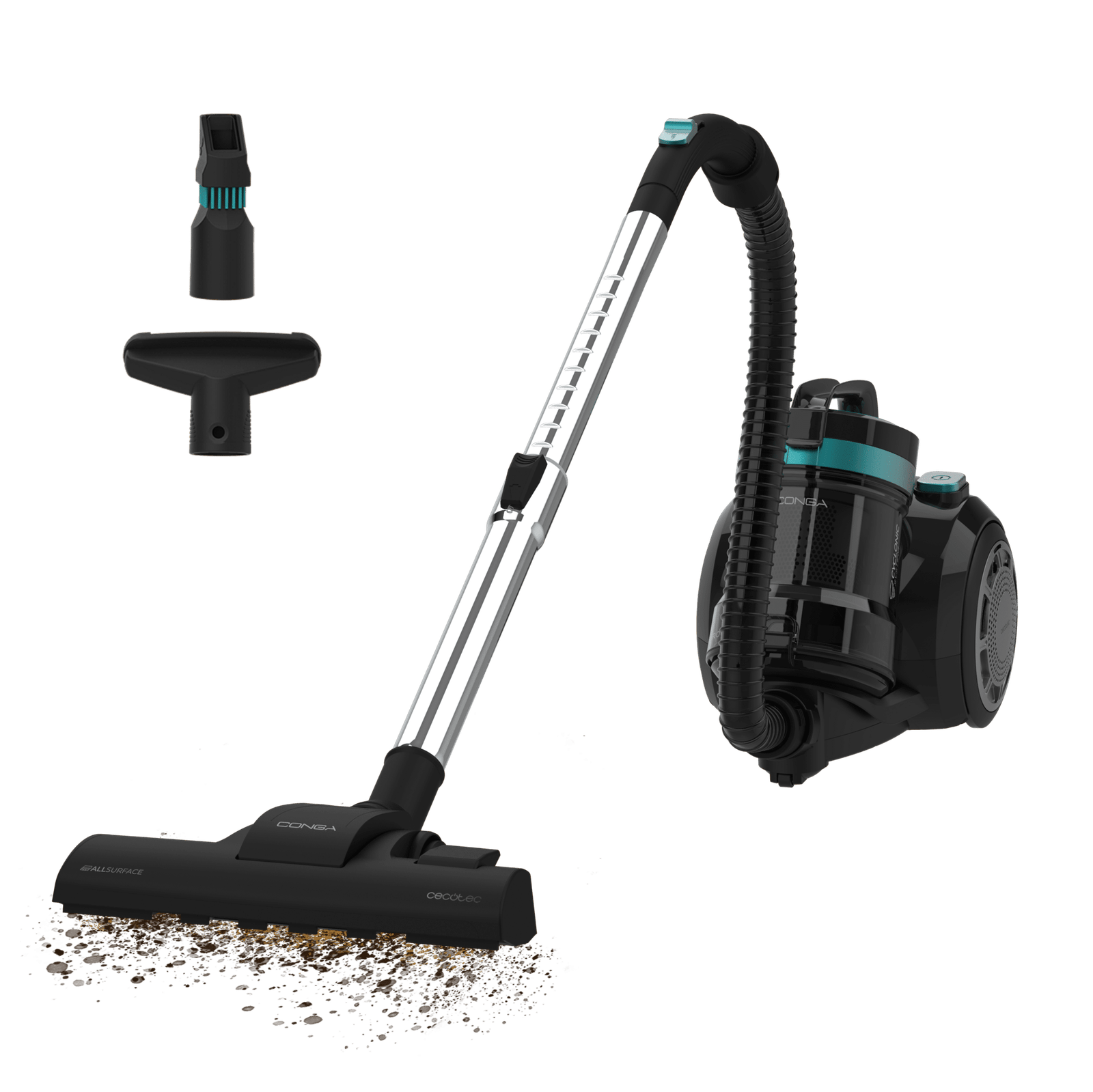 Conga Rockstar Cyclonic Plus Aspirador de trineo sin bolsa con una potencia de 800 W. Cuenta con un depósito de gran capacidad de hasta 2 litros, equipado con filtro HEPA para una mejor purificación del aire. Incluye un tubo telescópico metálico ajustable y accesorios diseñados especialmente para limpiar muebles y esquinas, facilitando la limpieza de las zonas más difíciles de alcanzar.
