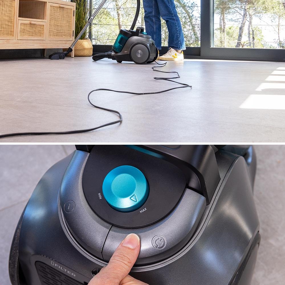 - Limpieza a medida. Regulador de potencia para ajustar la intensidad de aspiración según el nivel de suciedad y tipo de superficie, ahorrando energía.