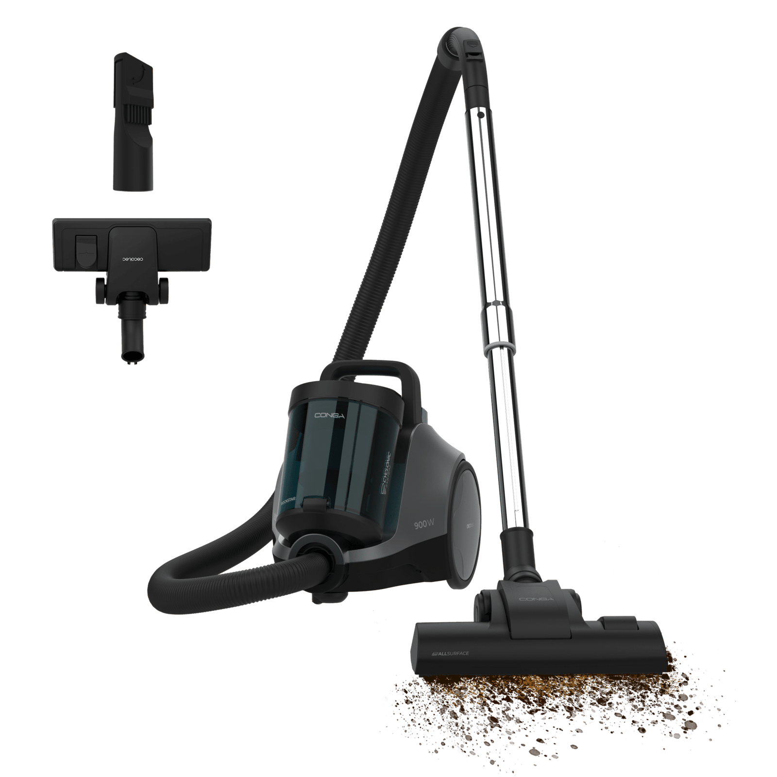 No importa el tipo de superficie: su potencia de 900 W atrapa todo tipo de suciedad, tanto en suelos duros como en alfombras.