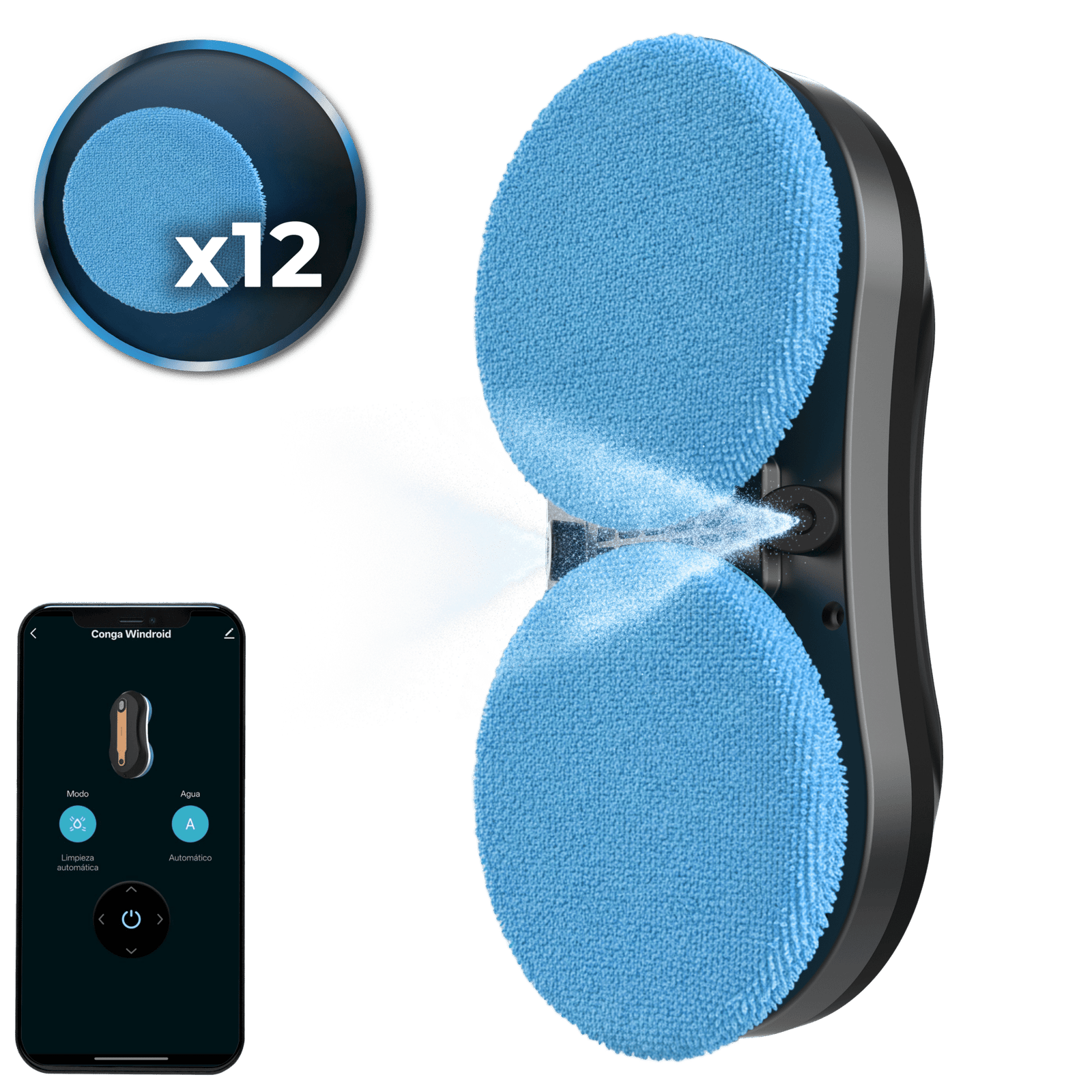 Conga Windroid W10 DoubleSpray Robot limpiacristales 3 en 1: pulveriza, limpia y seca. Pulveriza con spray en cada lateral. 4 modos de limpieza. Incluye app y mando para un control total de movimiento. Limpia en distintas superficies
