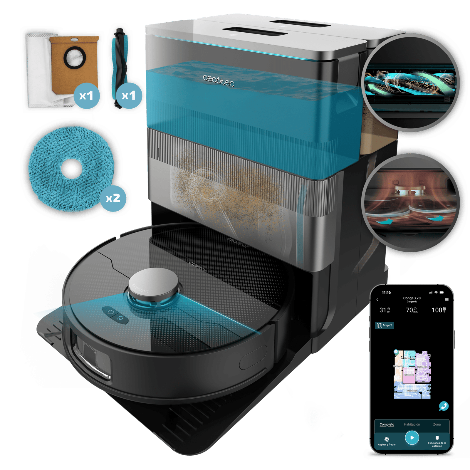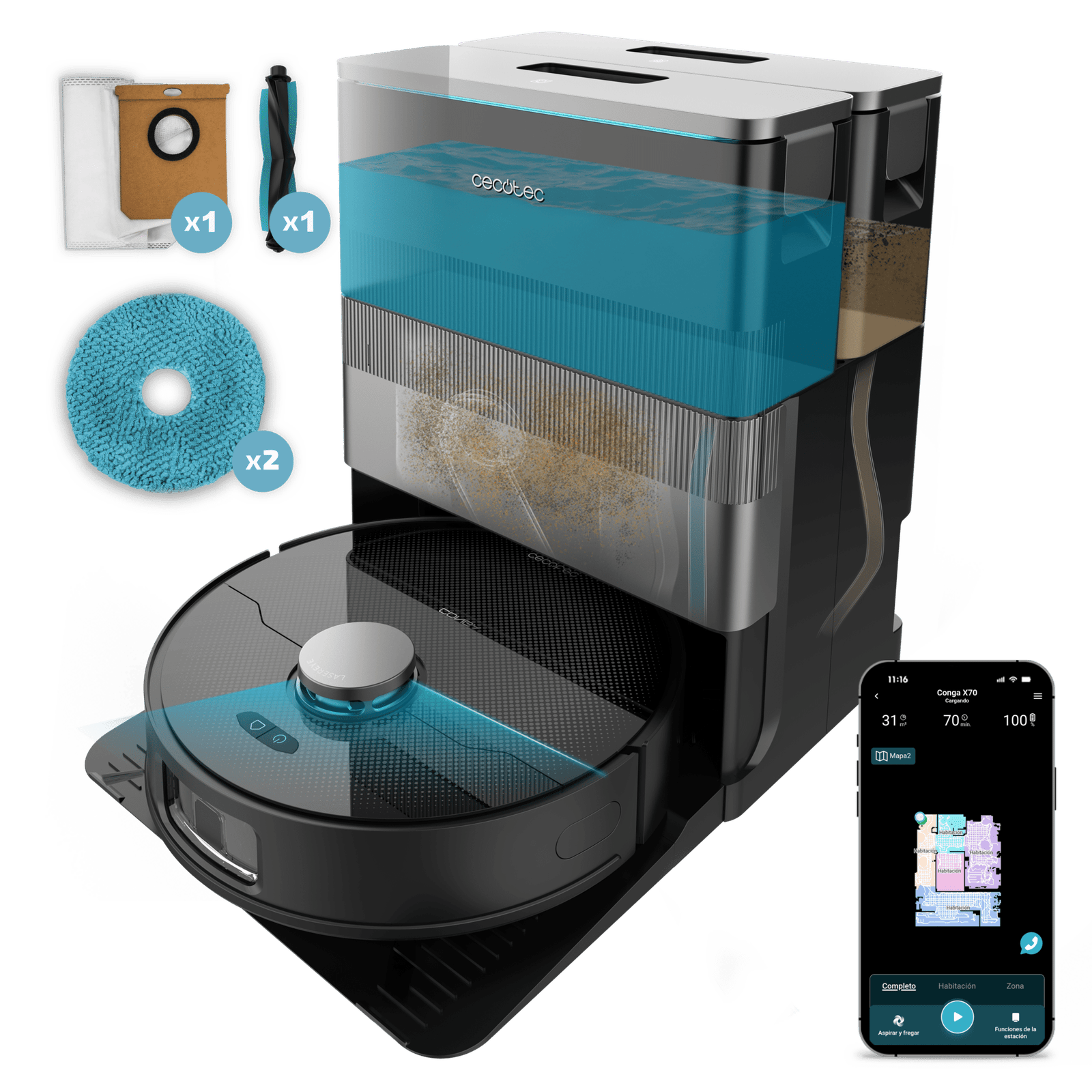 Conga X70 Robot aspirador con base autovaciado con Motor de succión 15000 Pa. Base 4 en 1. Tecnología láser e Inteligencia Artificial. Mopas giratorias. Cepillo lateral. App y conexión Bluetooth y WiFi para redes 2,4 GHz.
