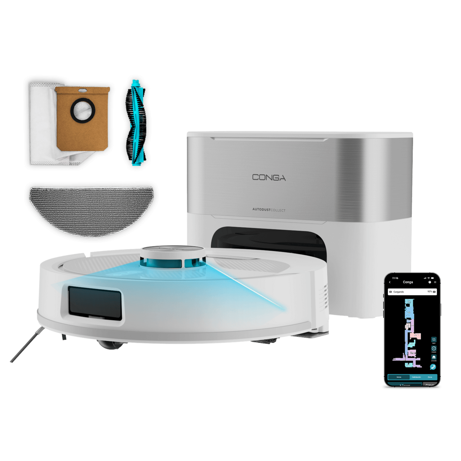 Conga Y60 Pearl Robot aspirador con base de autovaciado del polvo con Navegación láser. 13000 Pa de succión del motor. Autonomía de hasta 200 minutos en modo Eco. Cepillo multifunción apto para todo tipo de superficies. Bolsa de polvo de 3 L. Compatible con Bluetooth y WiFi para redes 2,4 GHz.
