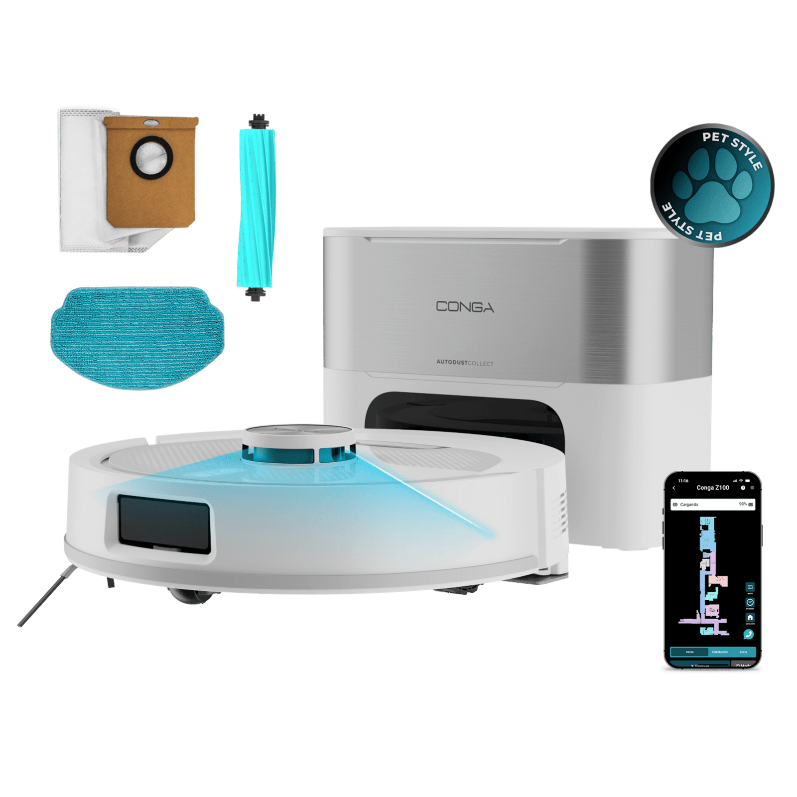 Conga Y80 Pearl Robot aspirador con base de autovaciado del polvo con Navegación láser. 25000 Pa de succión del motor. Autonomía de hasta 240 minutos en modo Eco. Cepillo silicona, ideal para casas con mascotas. Bolsa de polvo de 3 L. Compatible con Bluetooth y WiFi para redes 2,4 GHz.