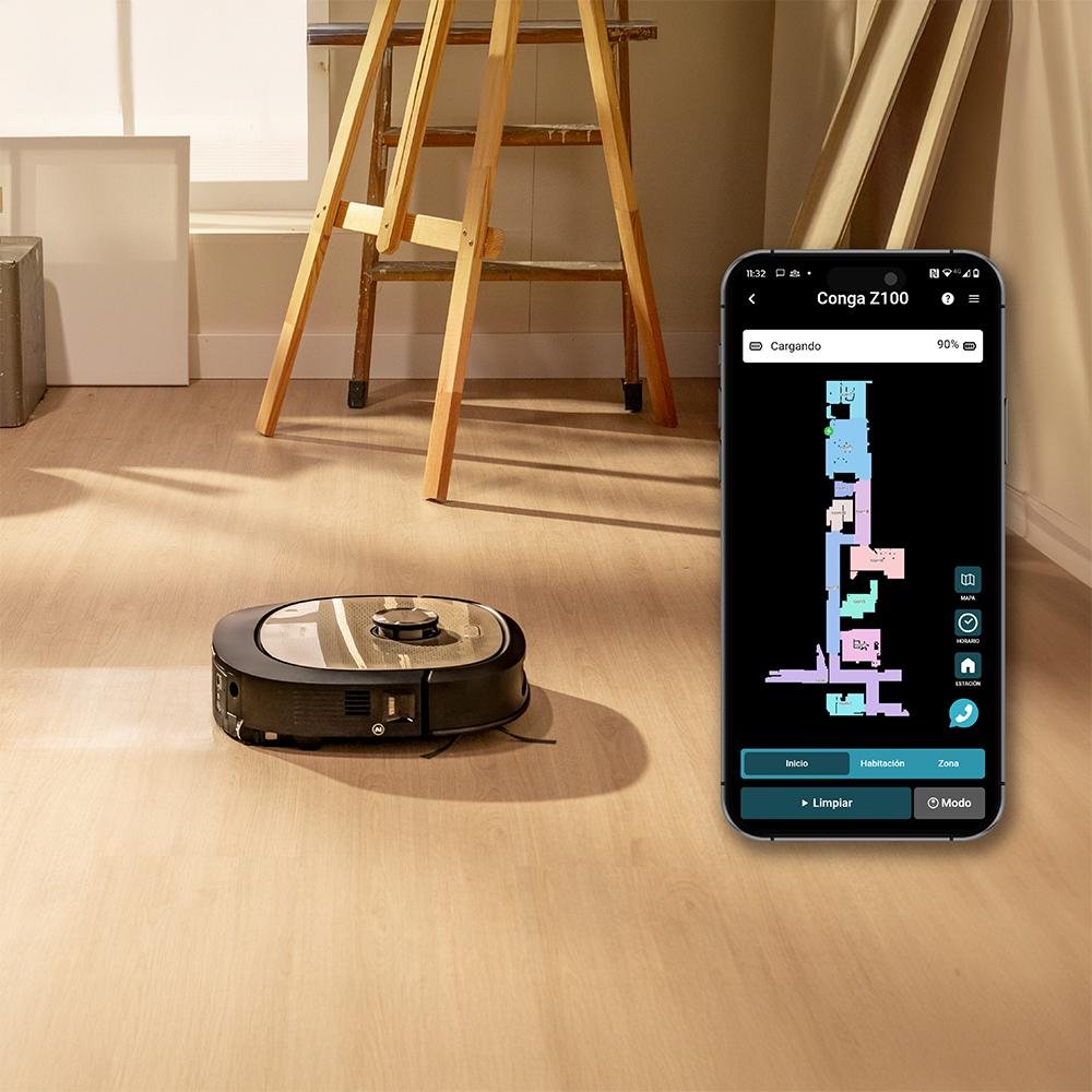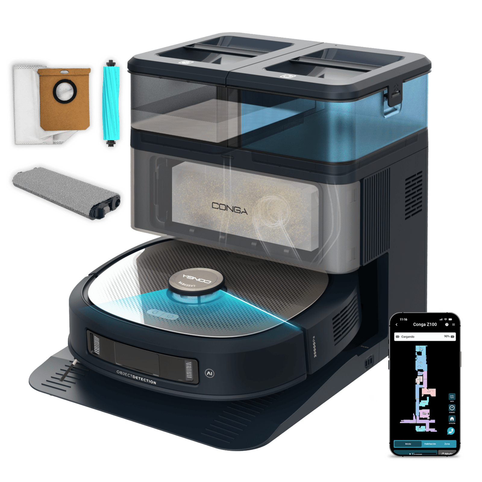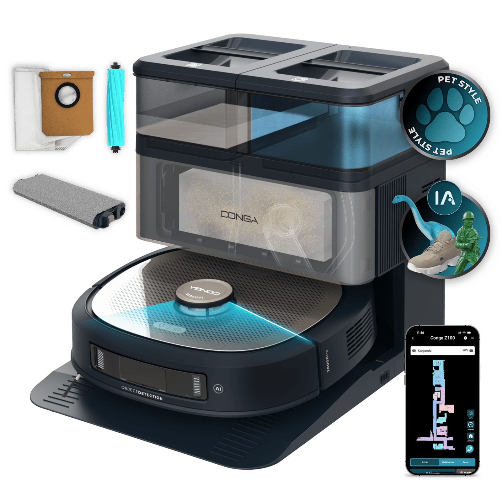 Conga Z100 Robot aspirador especialista en fregado con tecnología AI LaserEye. Fregado profesional con su mopa bimaterial XXL. Base total de autovaciado de polvo, de agua y limpieza de las mopas. 20000 Pa de presión de succión. APP y vinculación con Bluetooth y redes 2,4 y 5 Ghz.