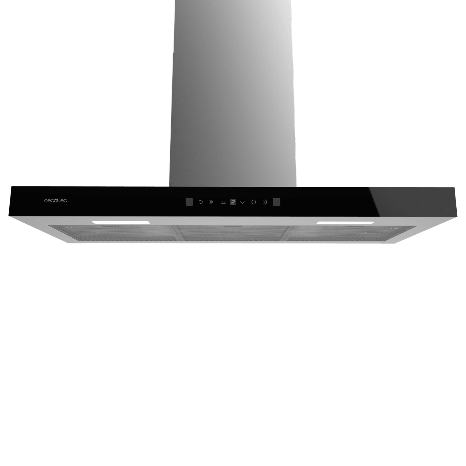 - Acabado frontal de cristal negro: campana extractora con acabados frontales de cristal negro, para un diseño estilizado y elegante.