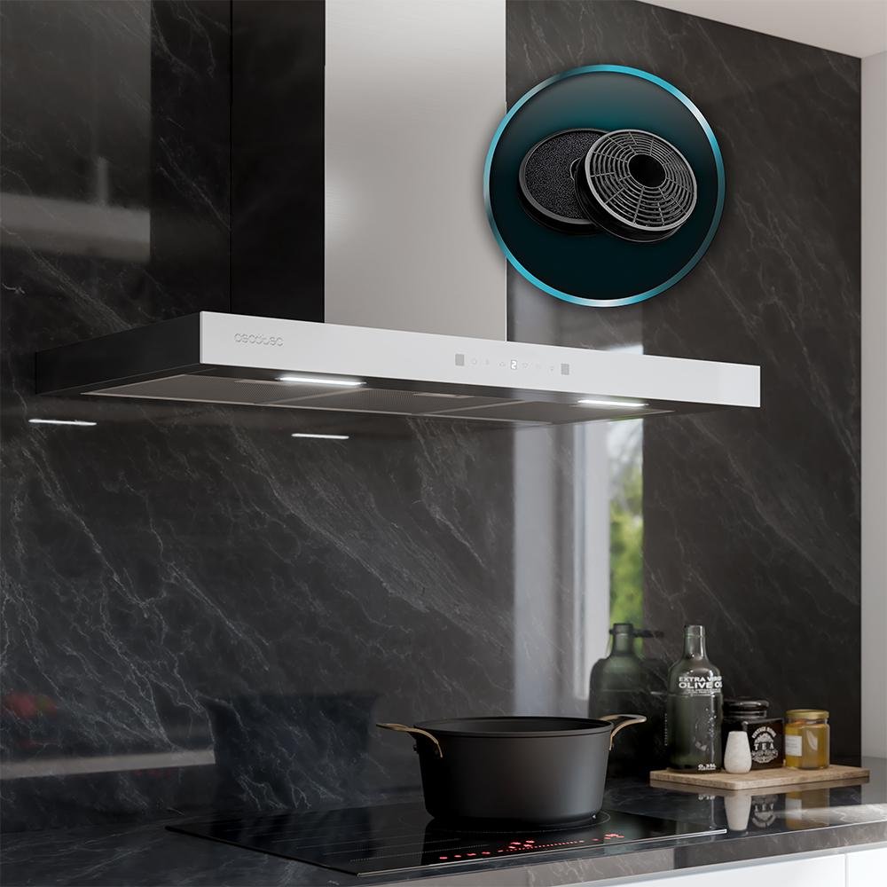 Sus dos filtros de carbono de Ø176 son ideales para complementar el potente motor de la campana, eliminando por completo los malos olores y el humo.