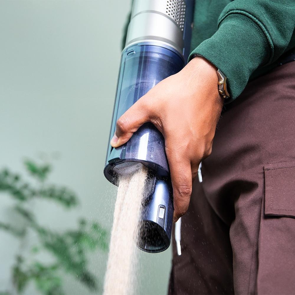 Olvídate de tocar el polvo gracias a su depósito con vaciado cómodo e higiénico, un clic y adiós suciedad.